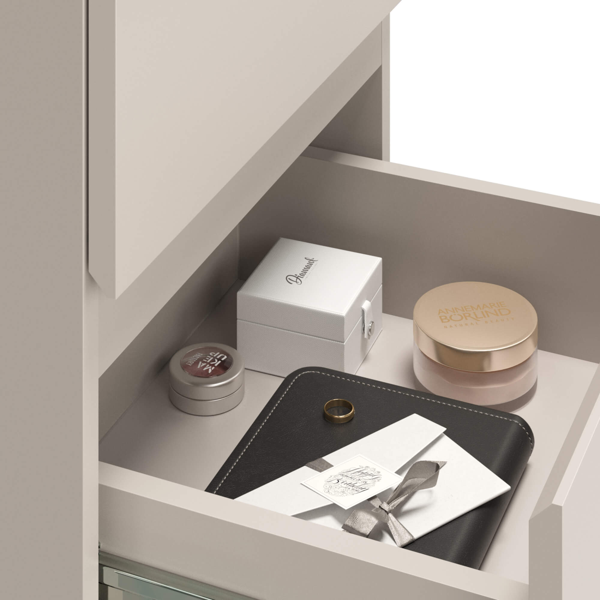 Корпус: ЛДСП 16 мм. Фасады: ЛДСП 16 мм. Тип направляющих: шариковые, без доводчика. Открывание: интегрированная в фасад ручка(без лицевой фурнитуры).