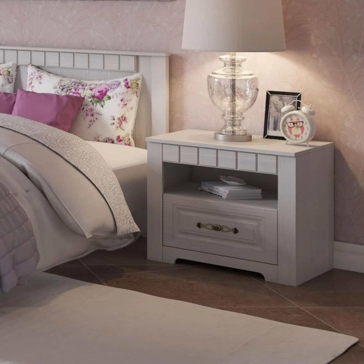 Прикроватная тумба имеет нишу и выкатной ящик для хранения различных предметов, таких как книги, журналы, очки или другие мелочи. Ящик оснащен качественными направляющими, которые обеспечивают плавное и тихое открывание и закрывание.