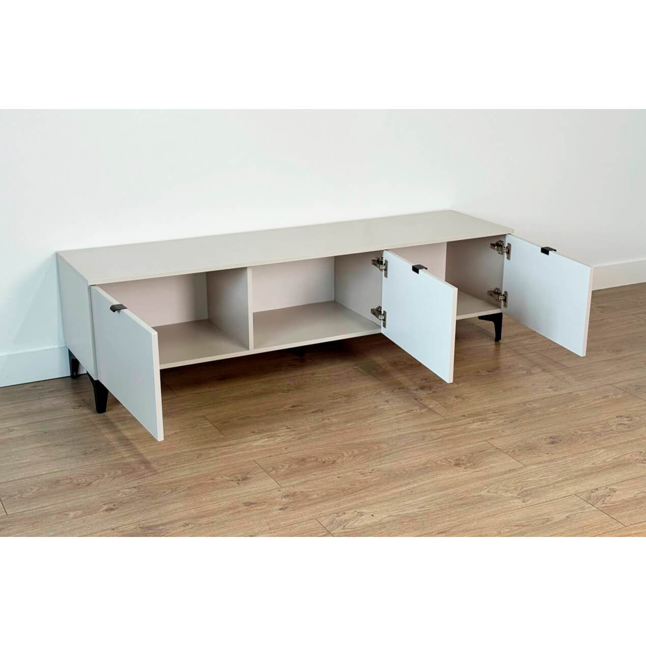 Тумба оснащена тремя распашными дверцами, которые открывают доступ к просторным внутренним полкам, идеально подходящим для хранения посуды, бытовой техники, аксессуаров или других предметов. Металлические ручки придают изделию современный вид и удобство в использовании.