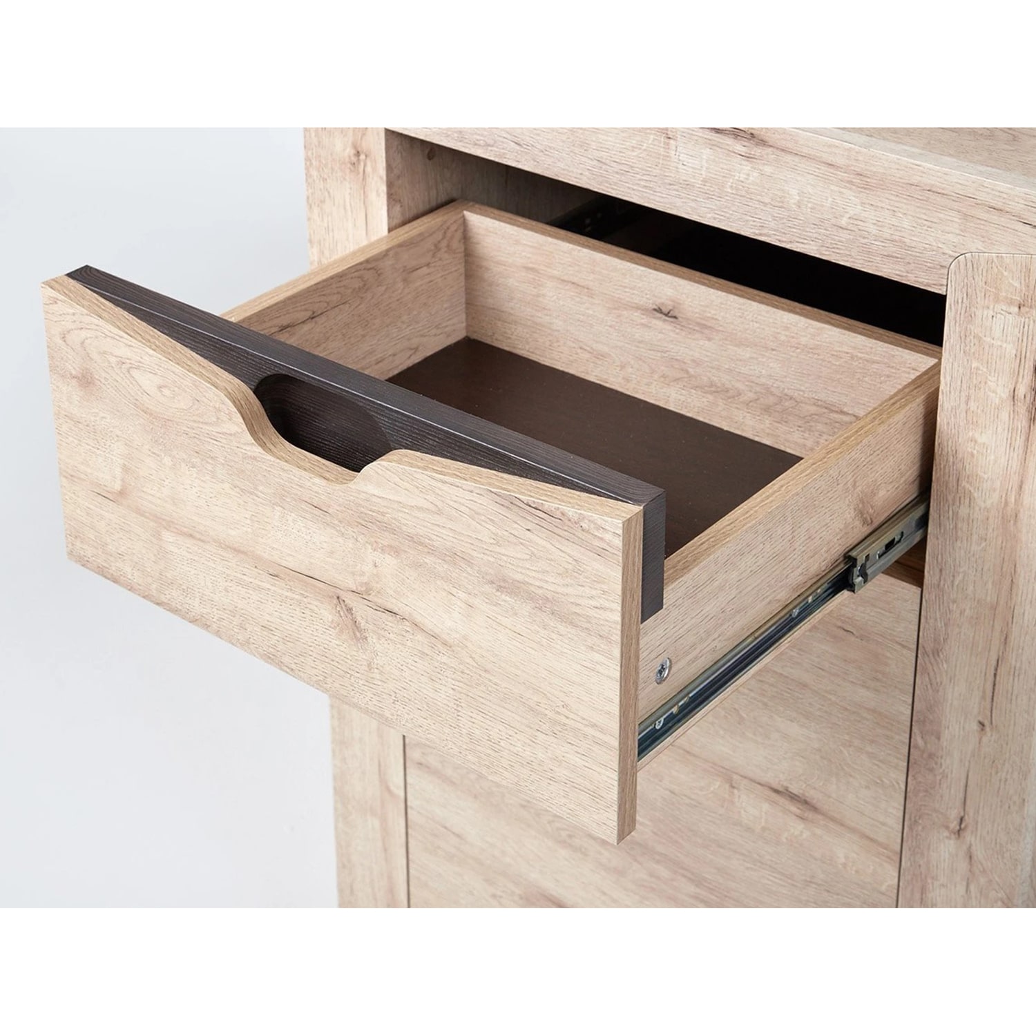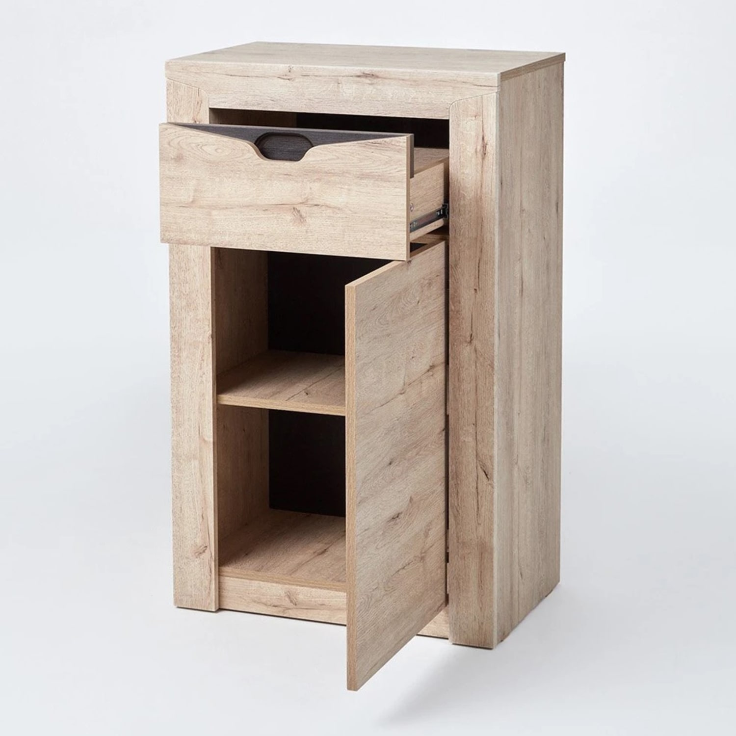 Тумба имеет распашную дверцу, за которой скрывается достаточно места для хранения обуви, а выдвижной ящик идеально подходит для хранения мелких предметов, таких как ключи, перчатки и шапки. Для открывания двери внутри устанавливается система Push to open открывающая ее после нажатия.