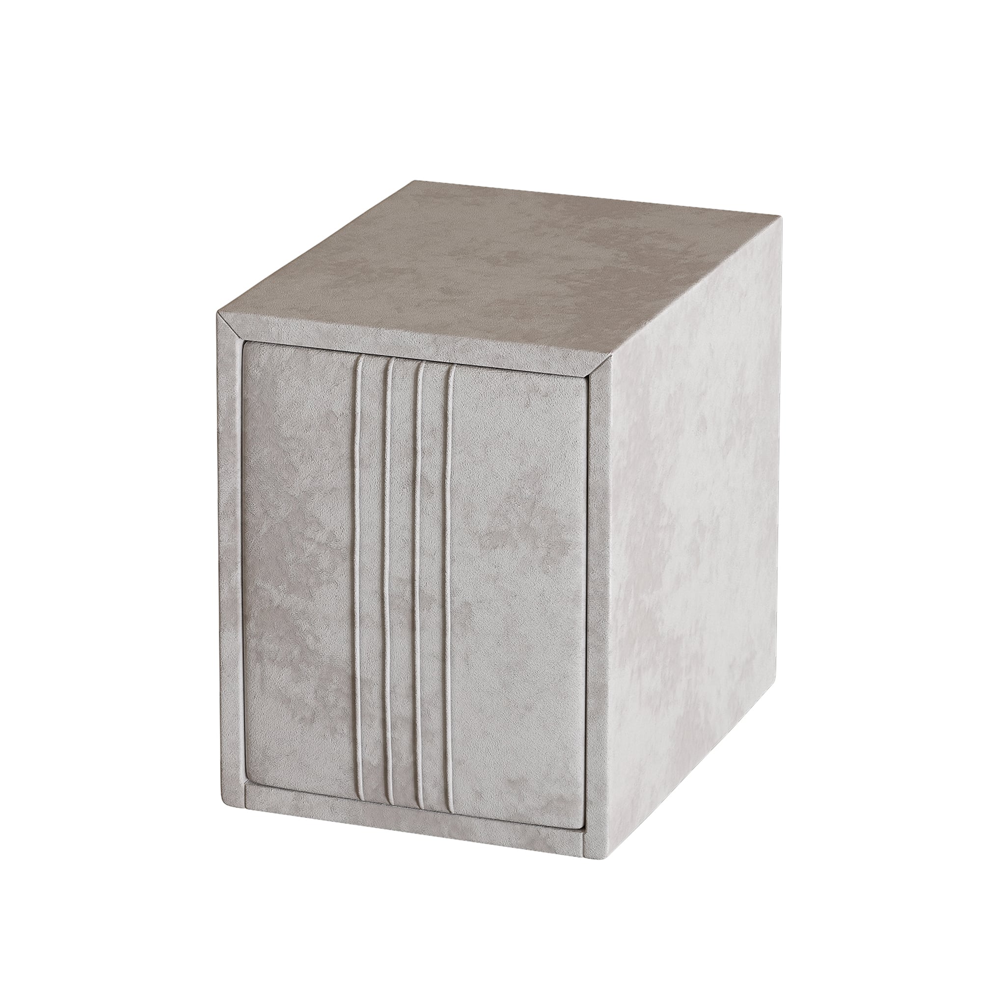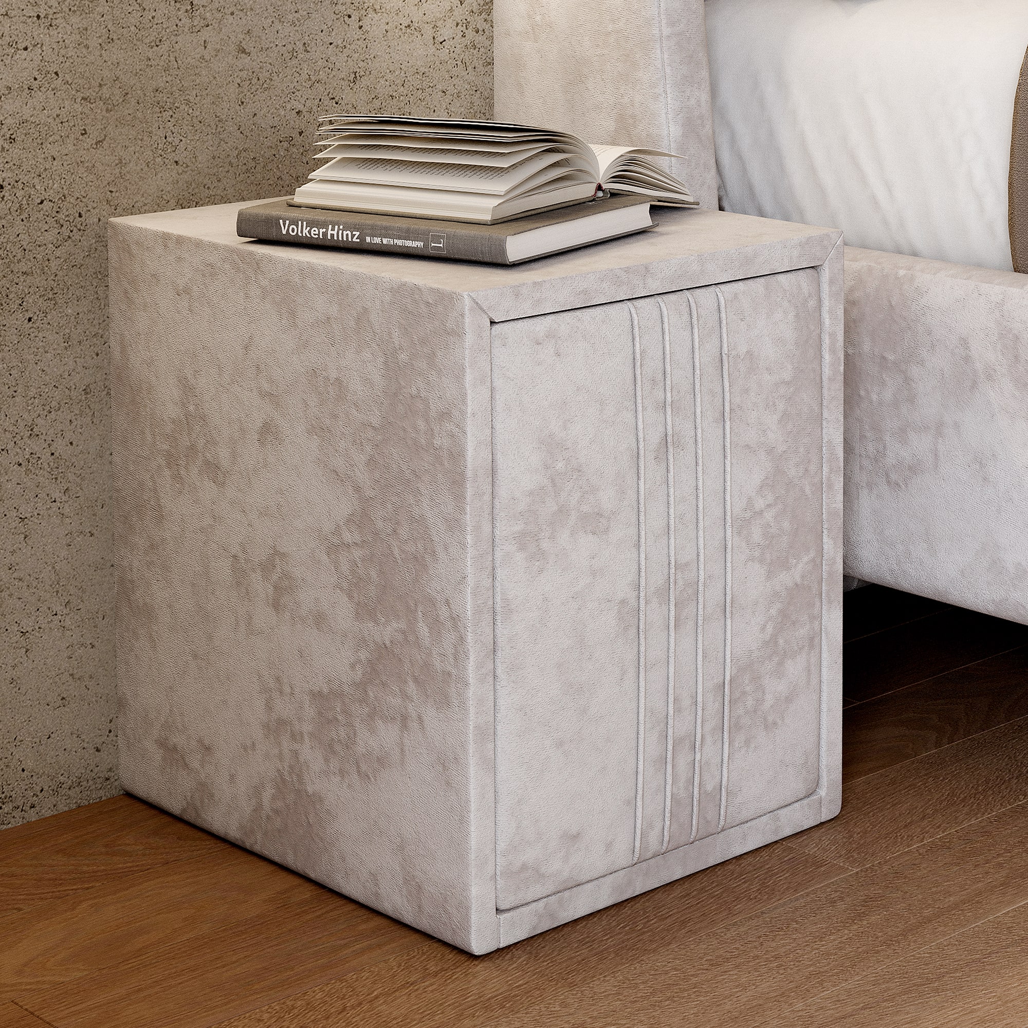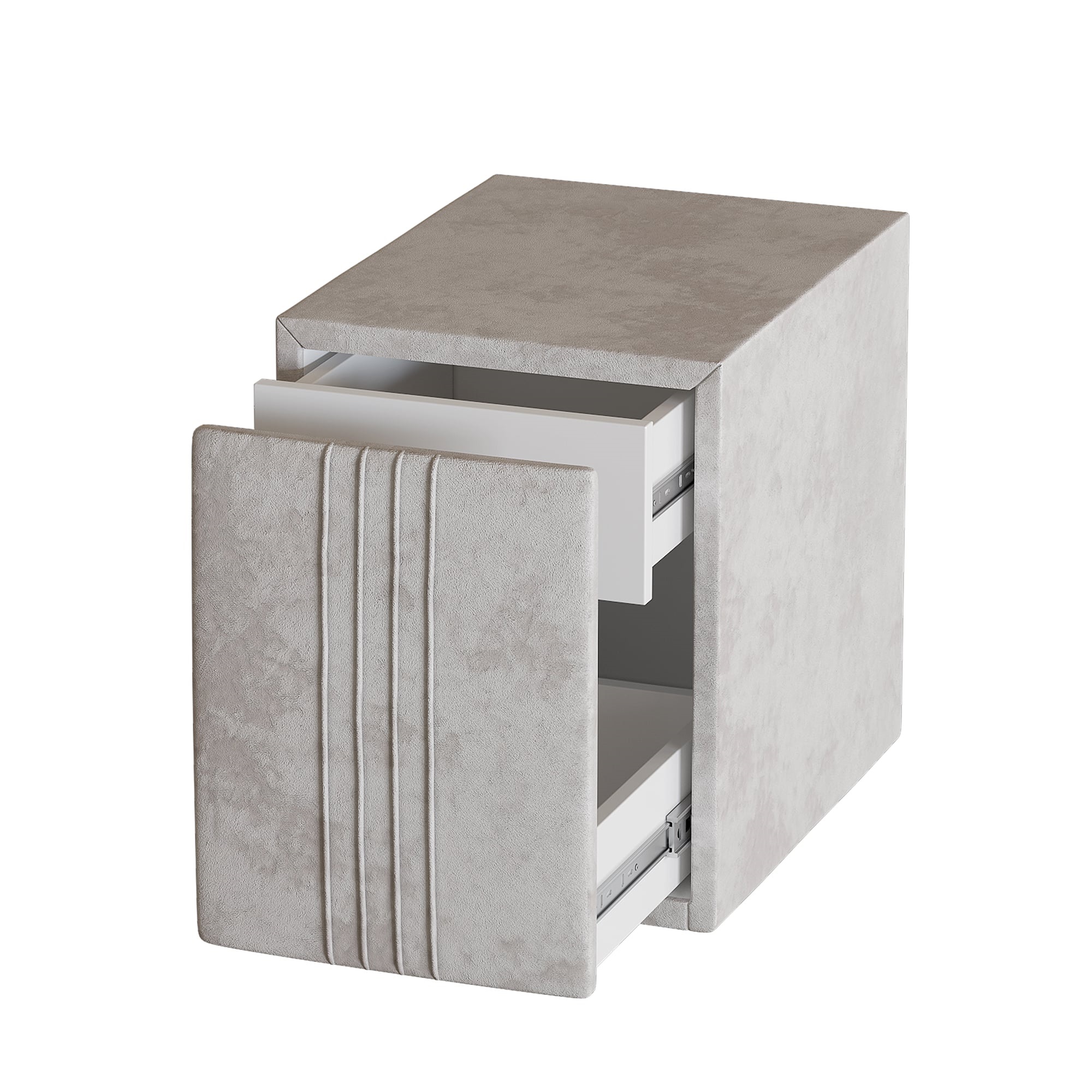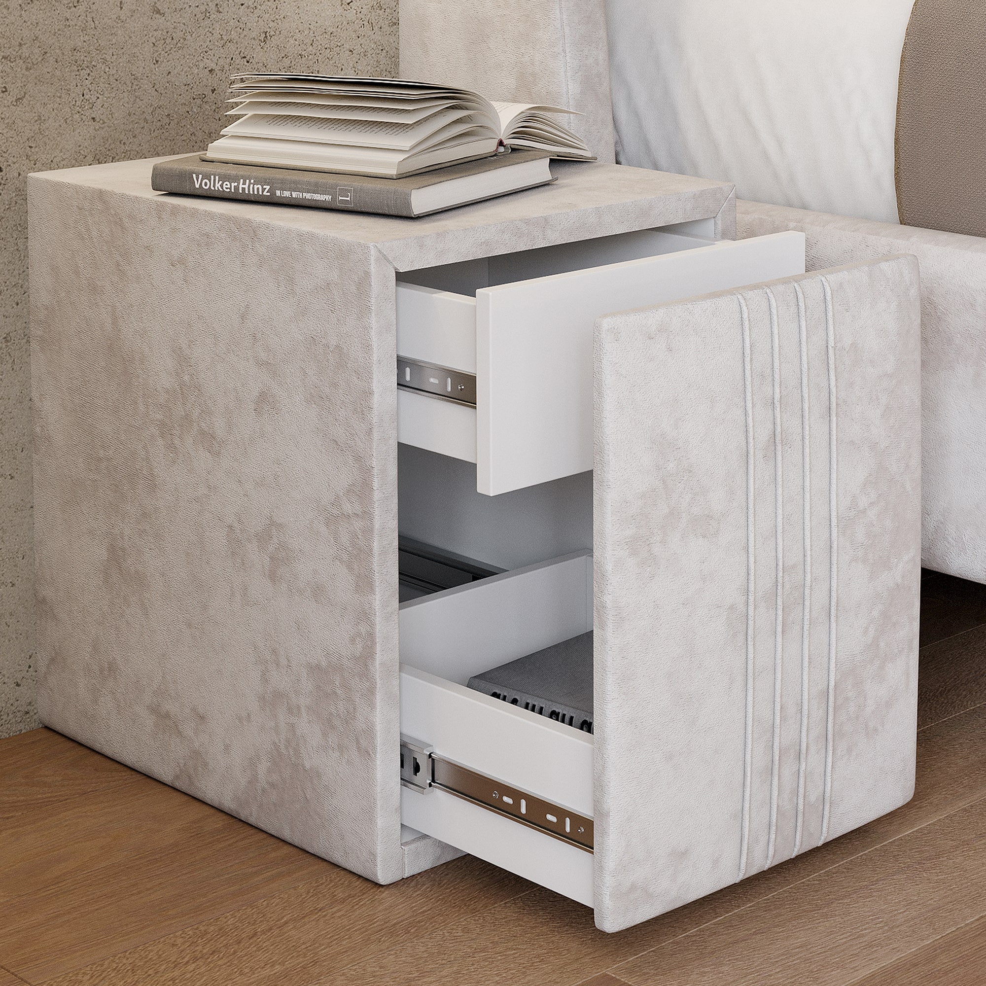 Тумба обтянута высококачественным велюром, имеет два вместительных выдвижных ящика с механизмом push to open. Скругленные торцы модели, минимизируют риск удариться в темноте.