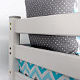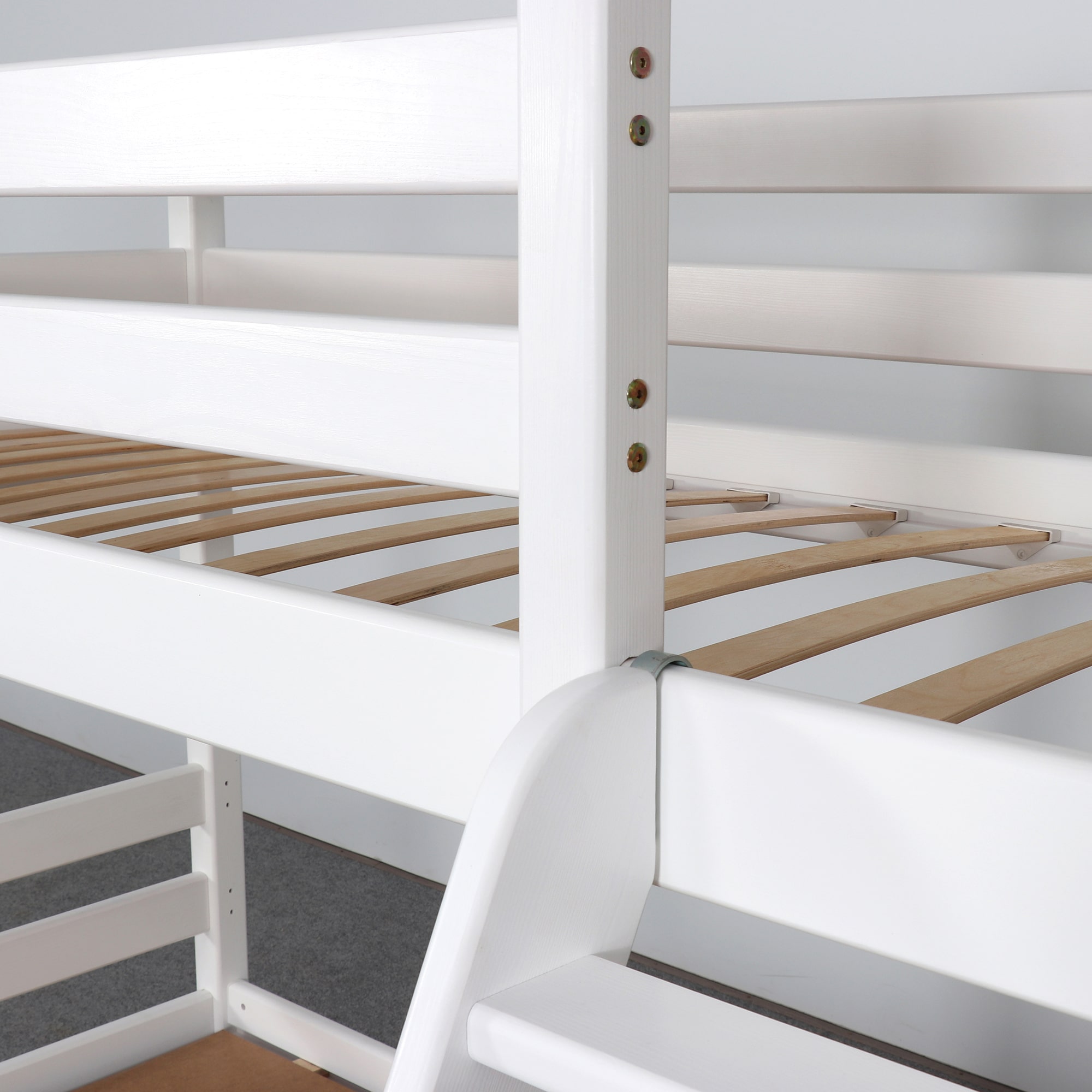 Увеличенное до 120 см по ширине спальное место нижнего яруса подходит для подростка, чей вес не превышает 70 кг. Верхнее основание имеет вид гнутых ламелей, с усиливающей перемычкой по периметру, нижнее представлено опорными брусками с уложенным поверх них настилом из шлифованного МДФ 10мм. Массив сосны подвергнут тщательной шлифовке и покрыт безопасным лаком на водной основе.