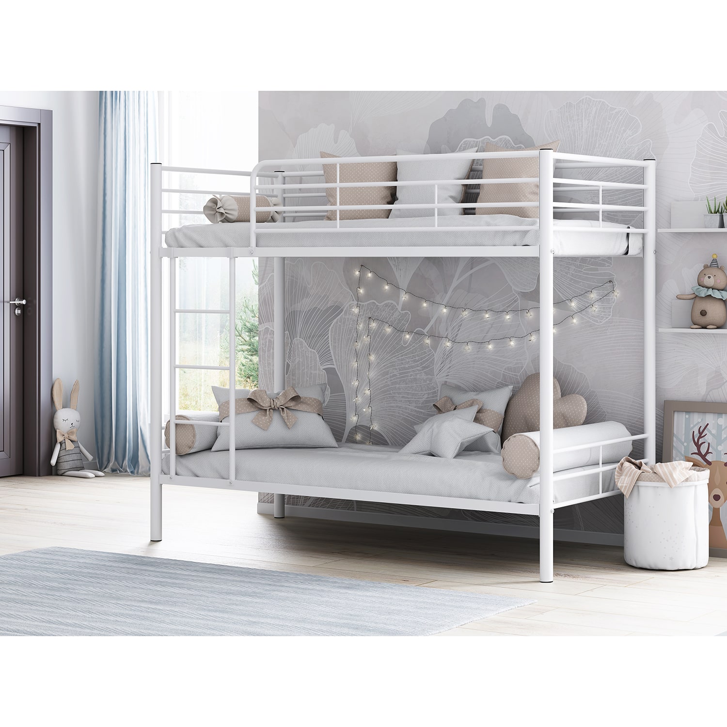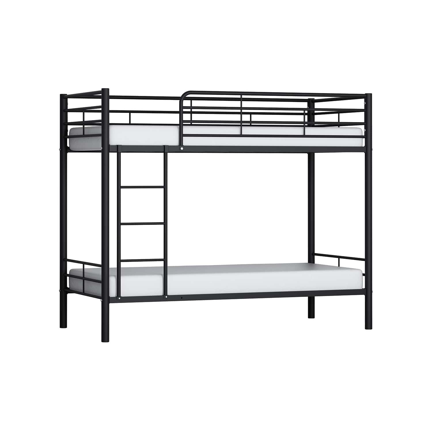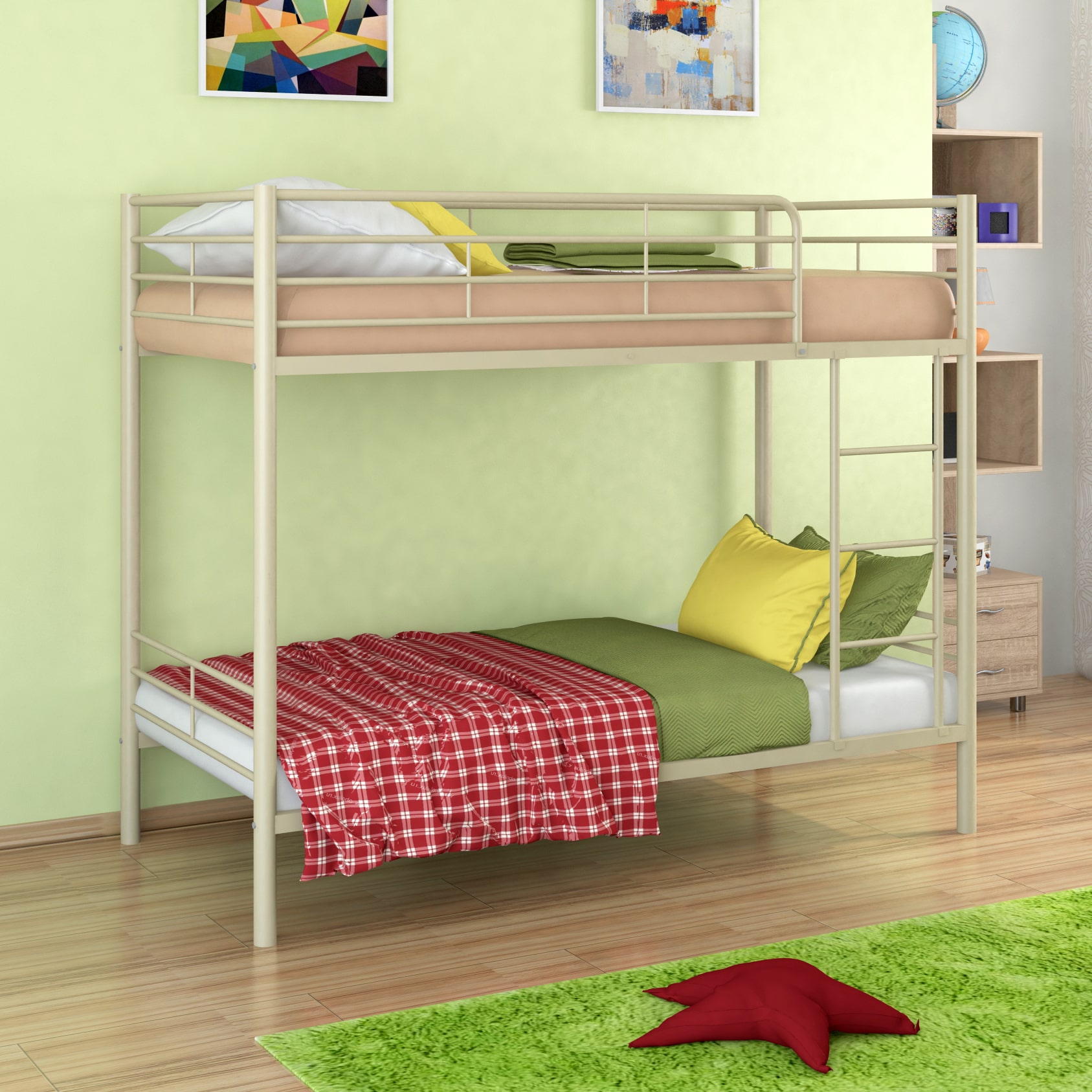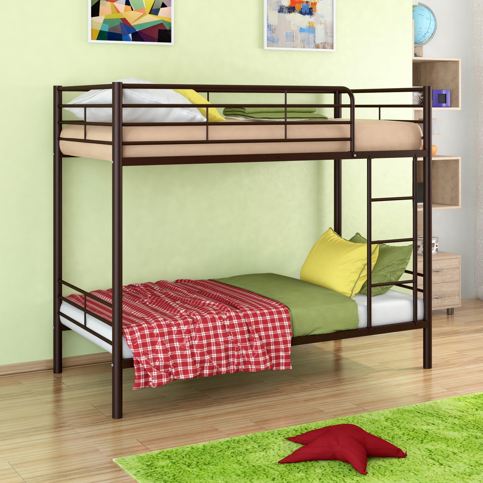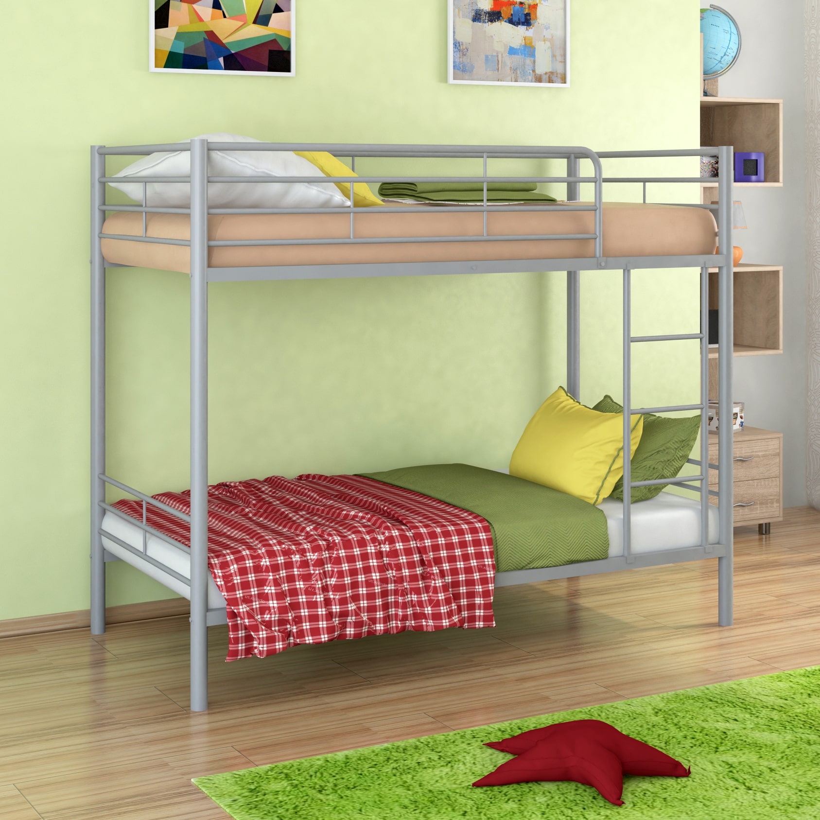 Все металлические элементы кровати покрыты износоустойчивой краской без запаха. Двухъярусную кровать можно собирать и разбирать неограниченное количество раз, и от этого она не потеряет в прочности и качестве.