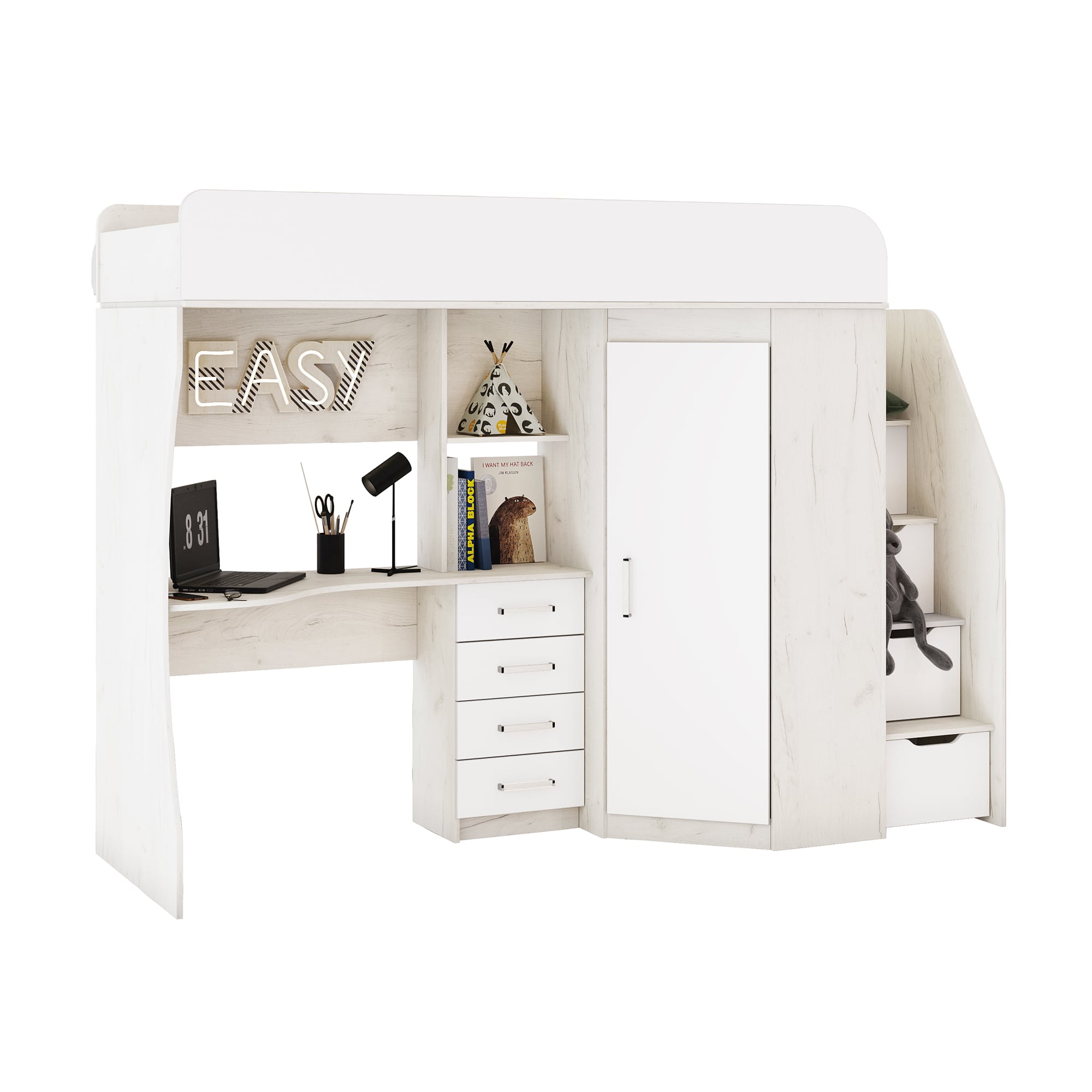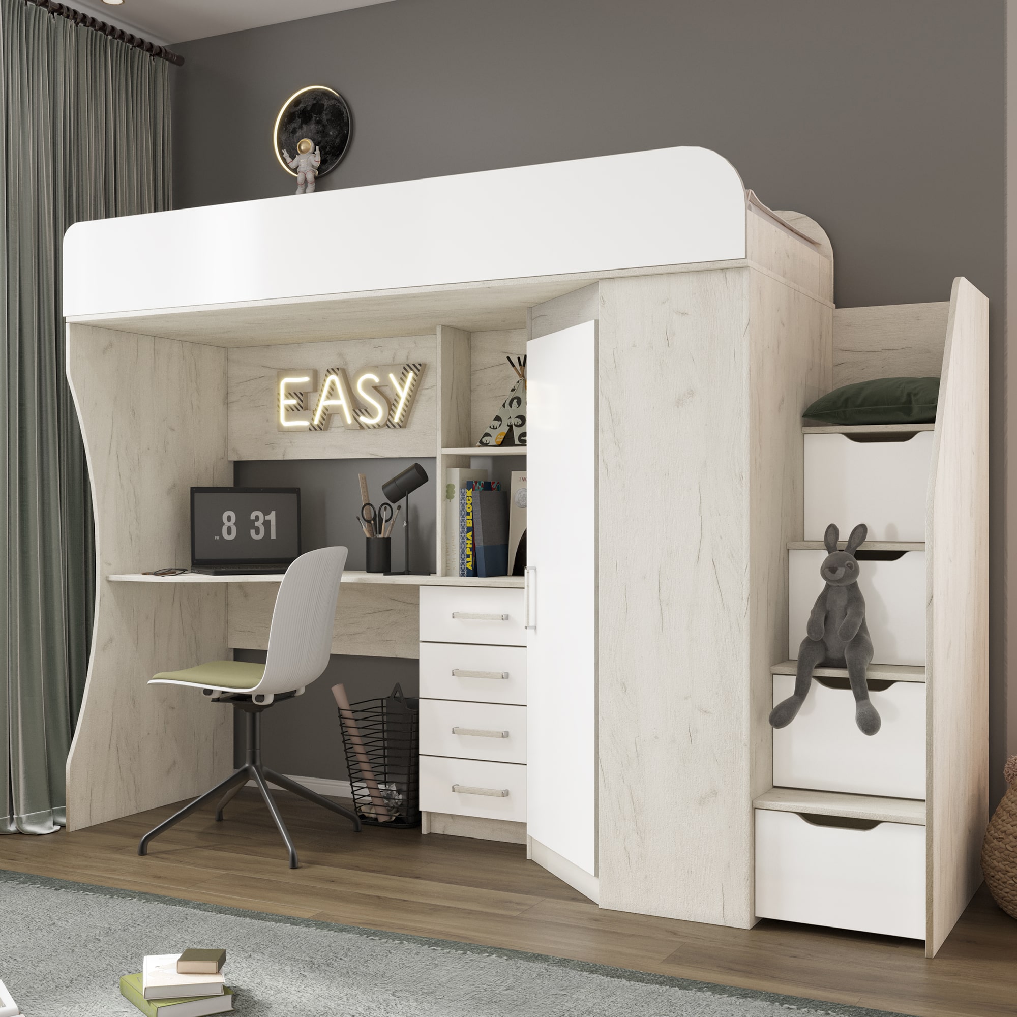 Кровать-чердак "Антилия" - удобное и практичное решение для детской комнаты, где каждый сантиметр на счету. Кровать-чердак совмещает в себе спальное место и рабочую зону для учебы или игр, а вместительный угловой шкаф позволят разместить все необходимые вещи. Комплект включает в себя компьютерный стол, что позволит ребенку комфортно заниматься уроками или творчеством. Благодаря компактности и функциональности, кровать-чердак станет идеальным выбором для малогабаритной детской комнаты.