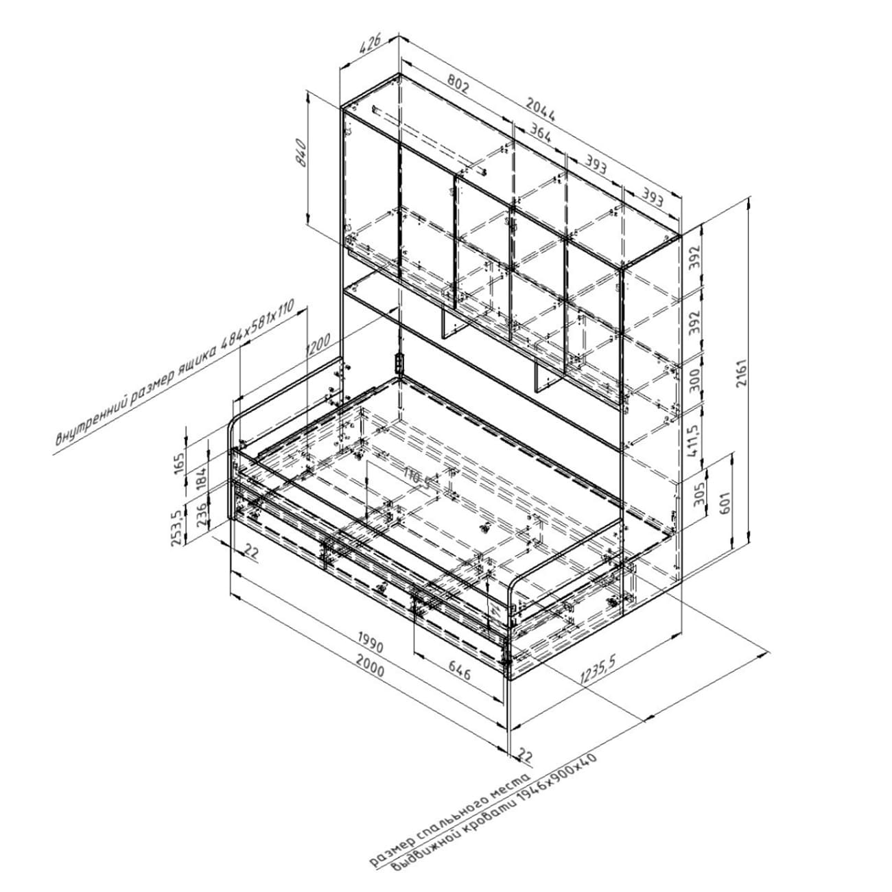 Размер гостевого спального места: 1950х900х40 мм, высота матраса не более 40 мм.