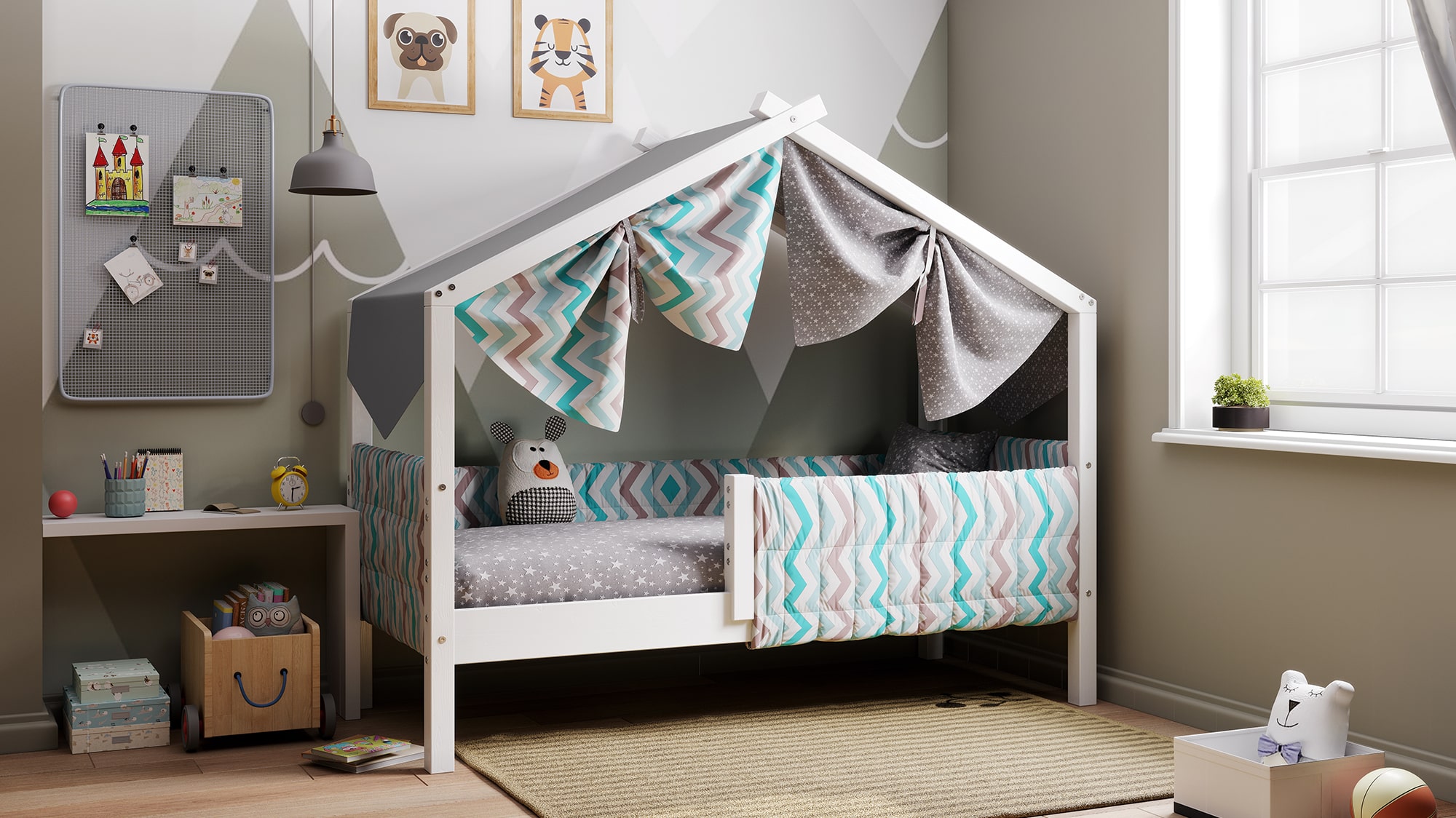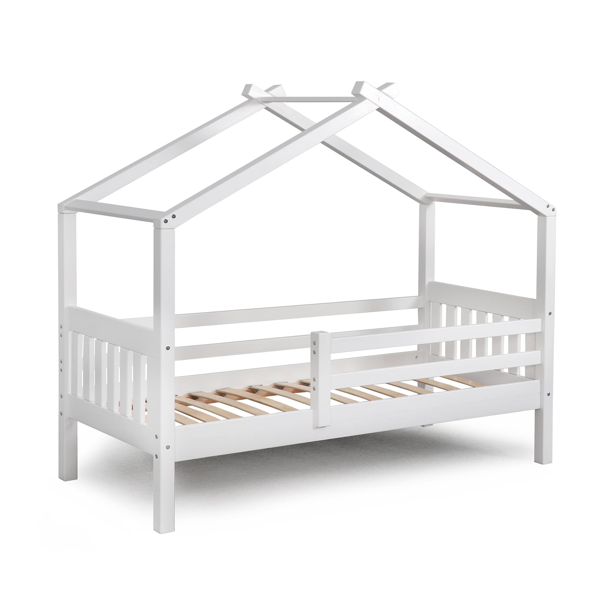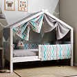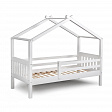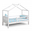 Каркас укомплектован основанием из поперечных гнутых ламелей. Головная и ножная спинки соединены стропилами, образующими крышу: если дополнить кроватку текстильными аксессуарами в виде балдахина и мягких бортиков, малыш будет ощущать себя в собственном уютном домике. В комплектацию кровати входит ортопедическое основание из гнутоклееных ламелей.