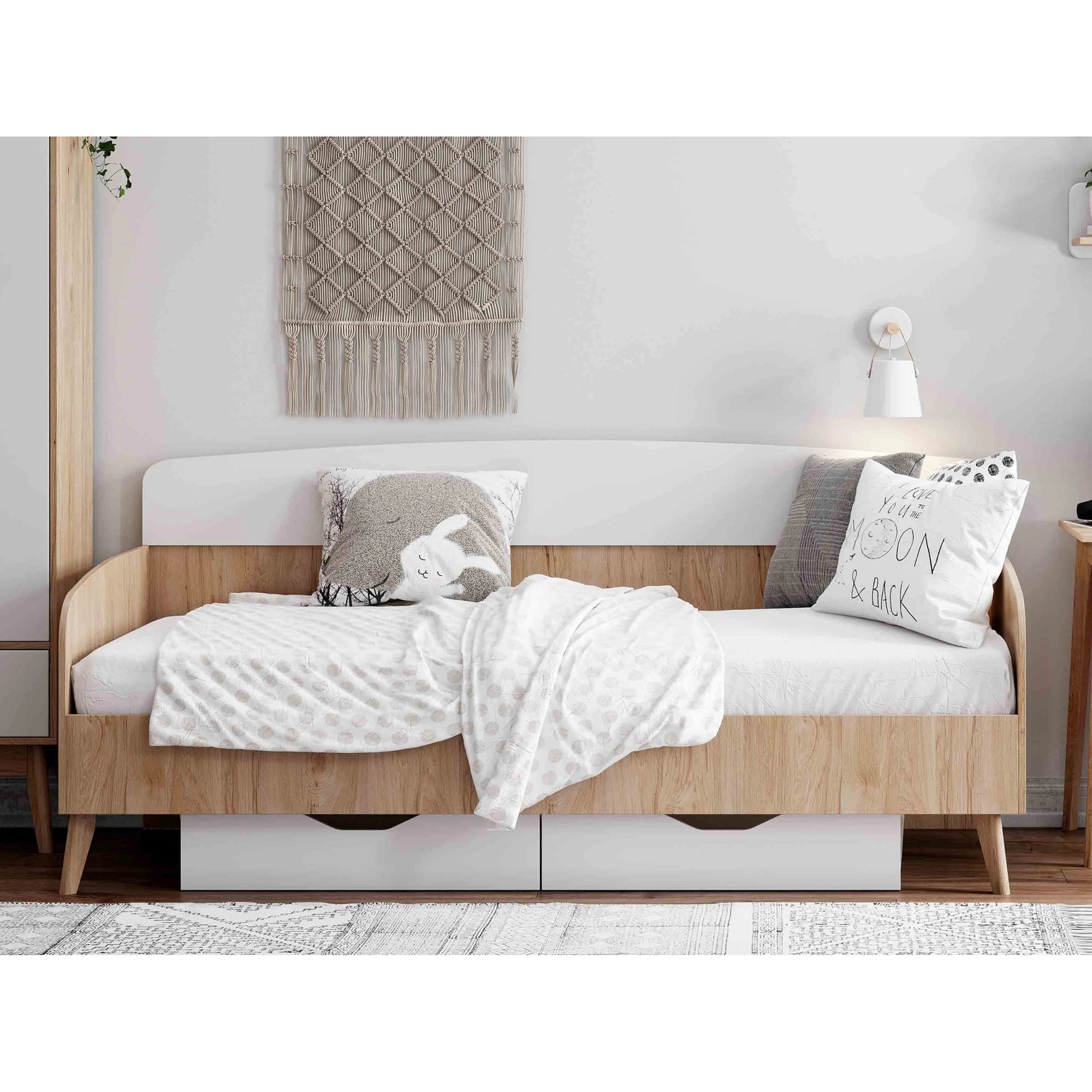 Кровать стоит на опорах из массива березы. Основанием матраса является настил из ЛДСП, закрепленный на стойках. Дополнительно может комплектоваться выкатным ящиком на роликовых опорах.