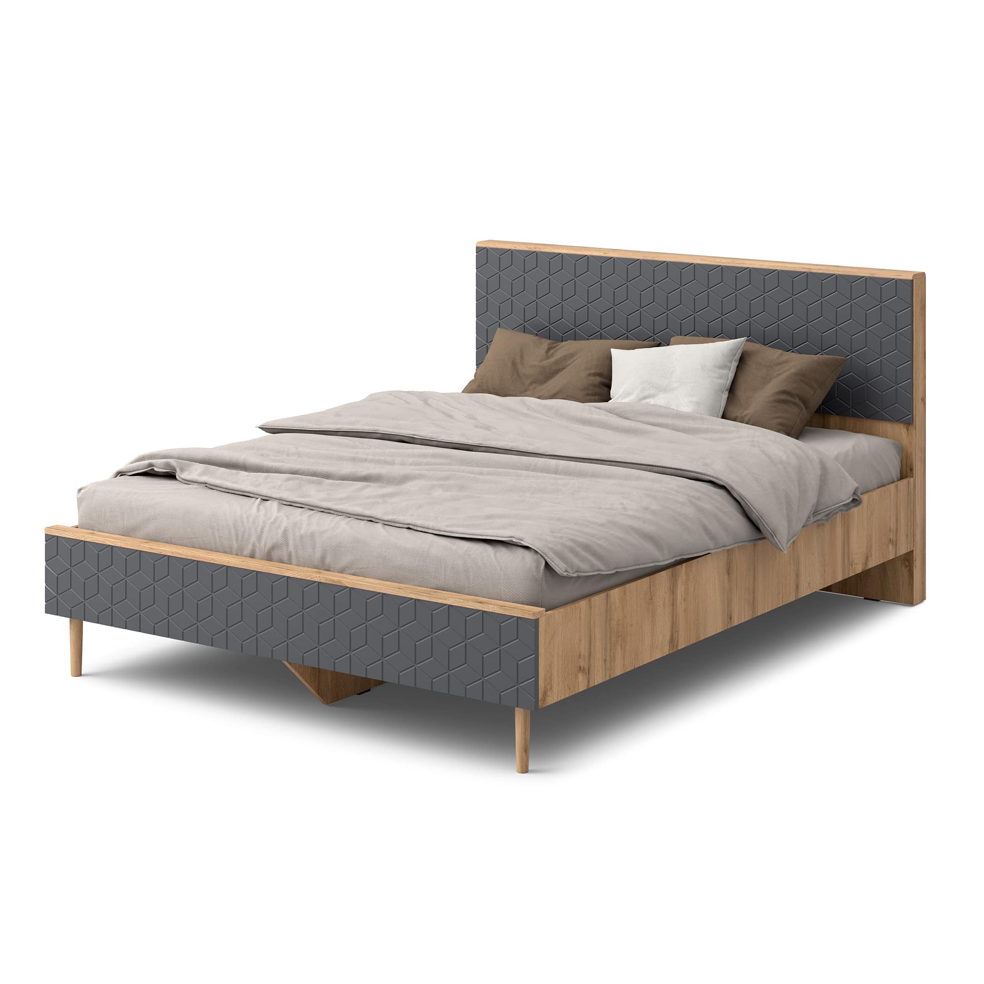 Кровать украшена фрезеровкой, представлена в шикарном цветовом сочетании “Дуб вотан/Графит”, которое привнесет в Ваш дом ощущение стиля, тепла и спокойствия. Опоры-ножки из массива березы, покрытые лаком придают конструкции визуальную легкость.
