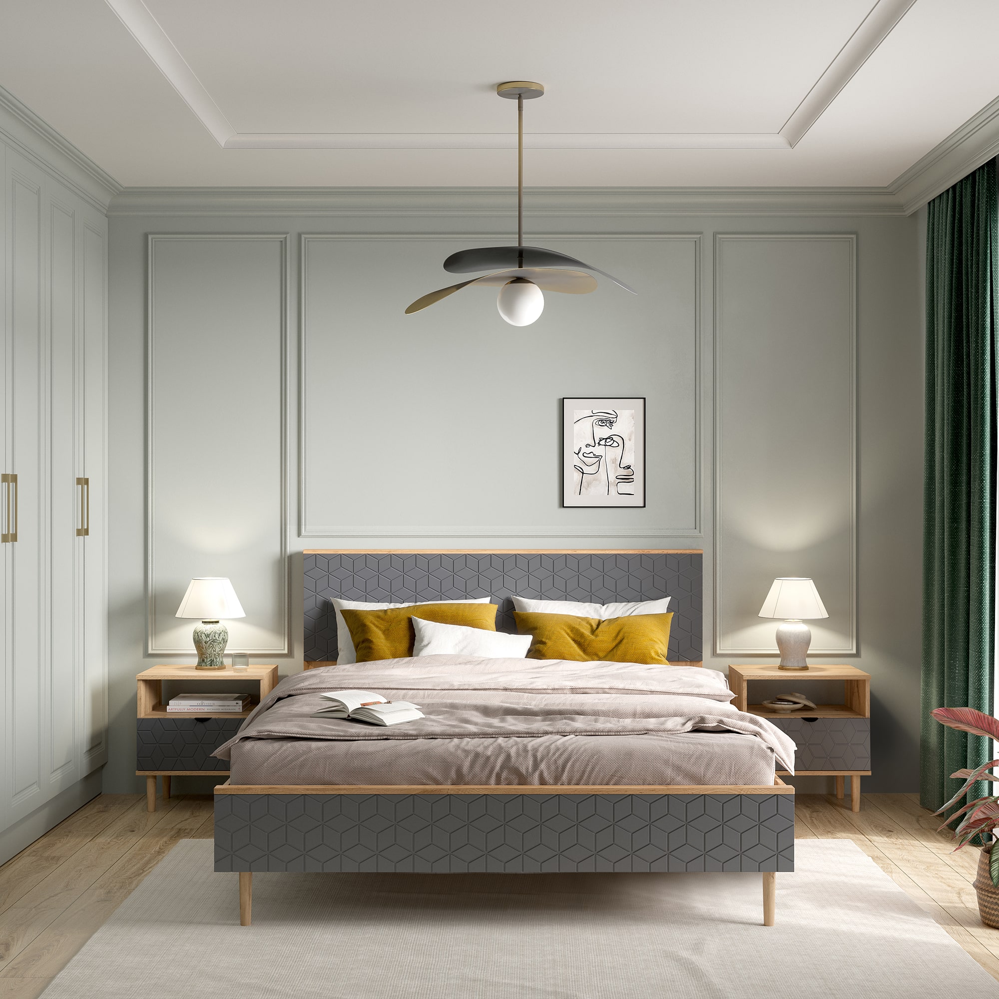 Серия “Денвер” — это изысканное и стильное решение для обустройства вашей спальни. Отличительной особенностью данной коллекции является изящная фрезеровка на фасадах в виде кубов, придающая им неповторимый шарм и элегантность.