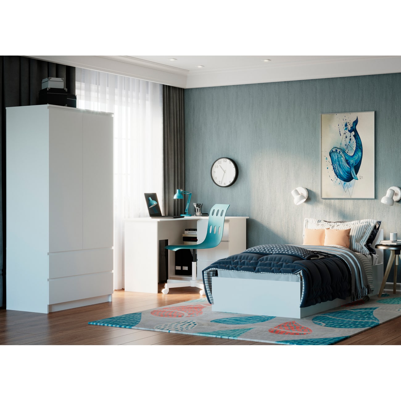 Коллекция мебели «Мори» включает в себя разнообразные решения, куда входят многосекционные комоды, кровати, шкаф и письменные столы. Удачное решение для зонирования комнаты позволяет максимально удобно убрать лишние предметы в шкаф или в комод, тем самым сохраняя единый стиль оформления помещения. Для изготовления мебели используются экологически чистые материалы и отделка. Белый цвет мебели не теряет со временем свой цвет и будет радовать владельца приятным теплым оттенком.