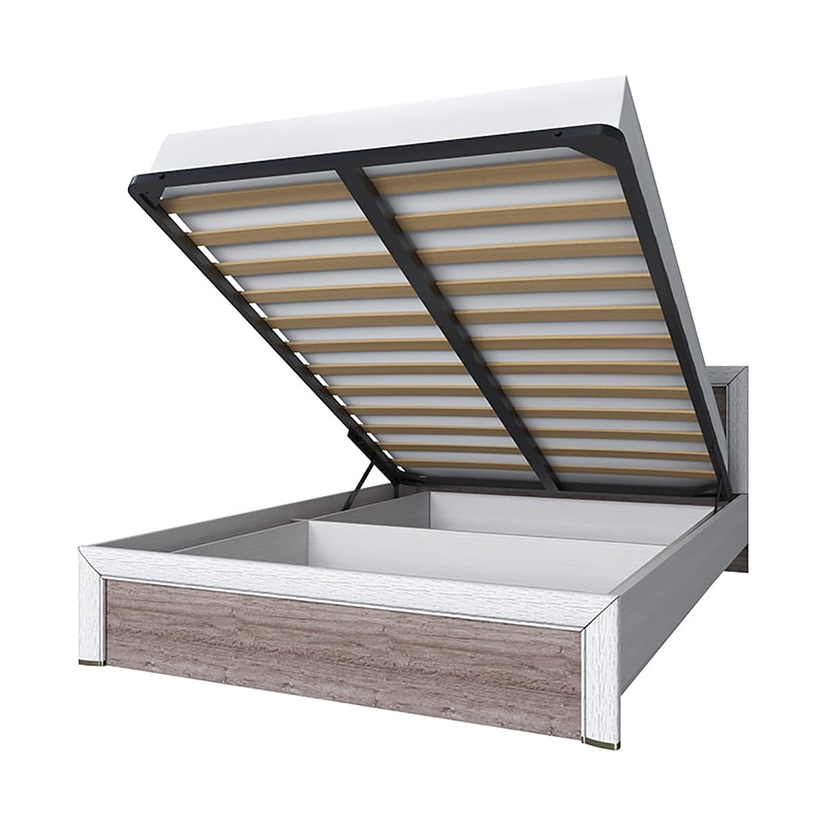 Кровать Оливия 160. Кровать 160 с подъёмным механизом – двухспальная, размер спального места – 1600*2000 мм (ширина - 1651 мм, глубина - 2059 мм). Конструкция кровати представлена сплошным изголовьем и изножьем прямоугольной формы в цвете Дуб анкона, царгами и металлическим основанием с подъёмным механизмом, большими удобными ящиками для хранения вещей, белья и предметов быта. Деревянные ламели служат дополнительной амортизирующей основой.