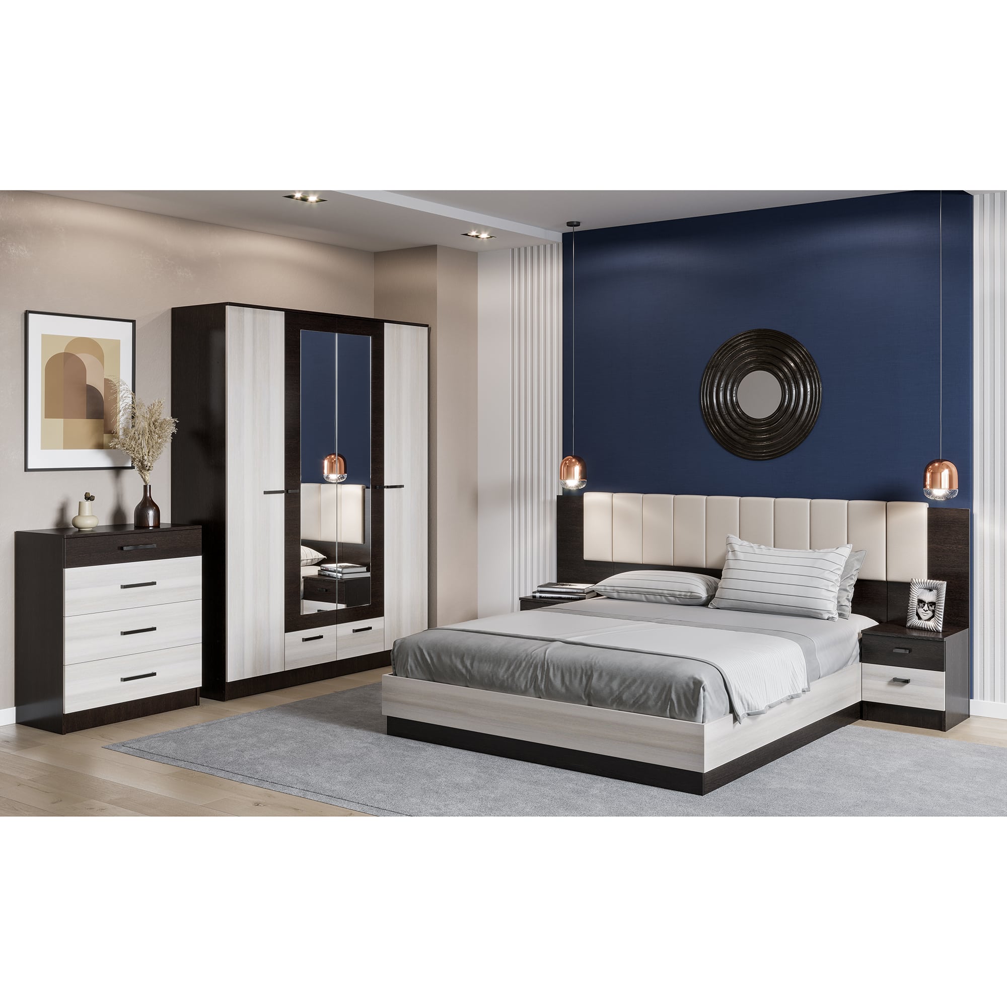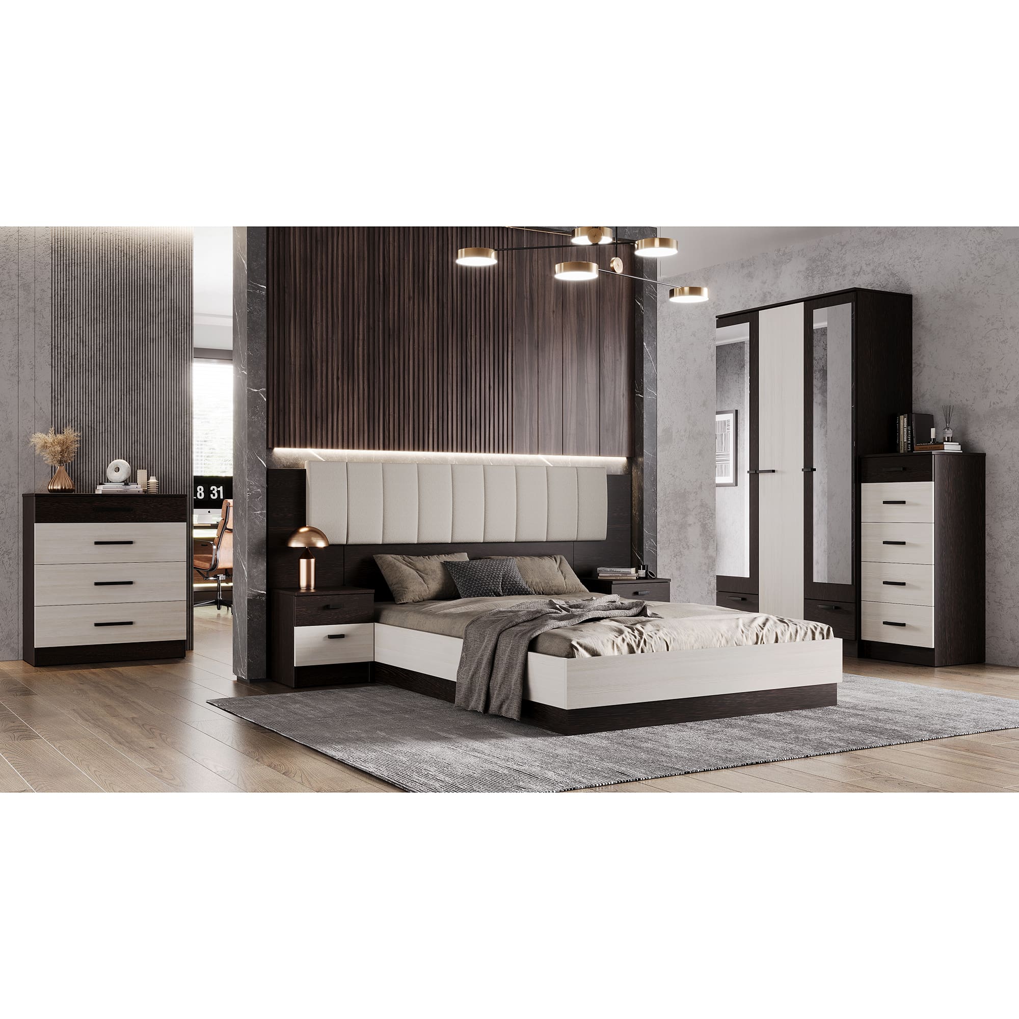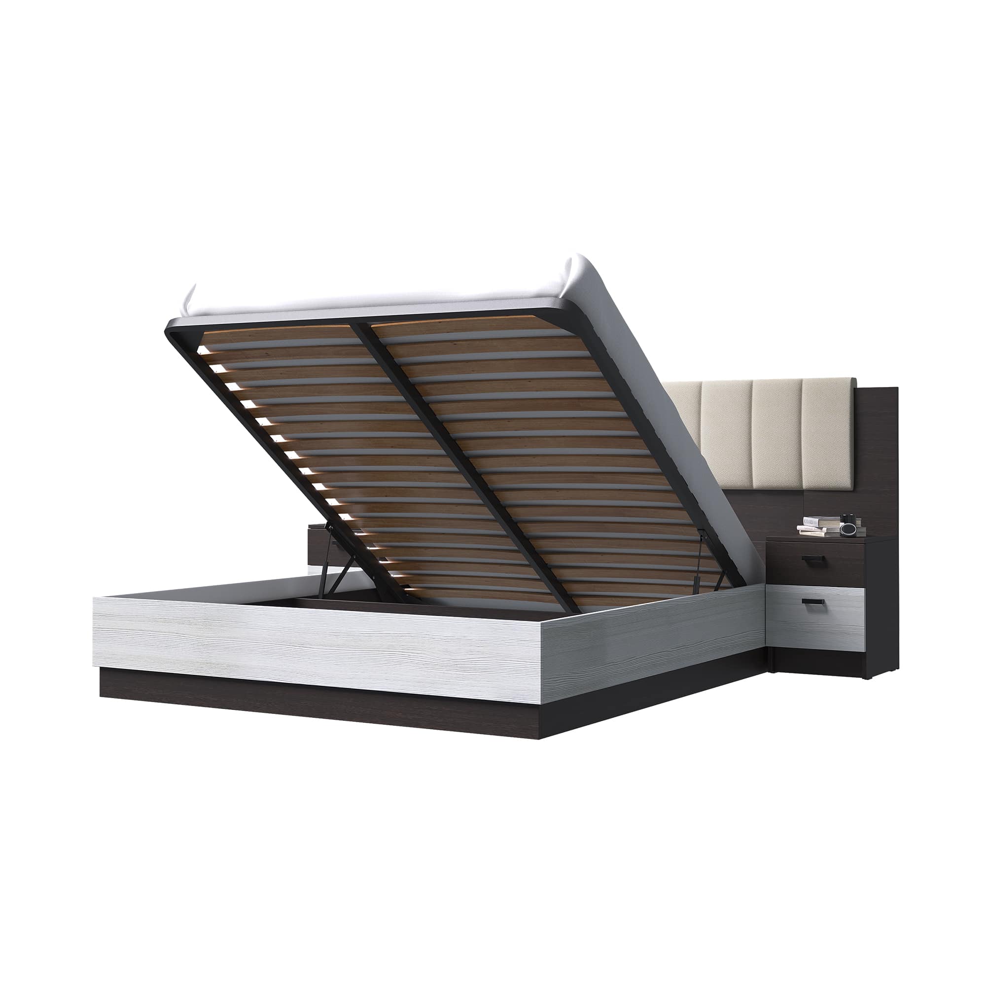 В комплект входит: кровать с подъемным механизмом, мягкая накладка, две тумбы.