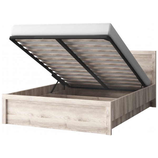 Конструкция кровати представляет собой сплошное изголовье прямоугольной формы и изножье прямоугольной формы, царги и металлическое основание с подъёмным механизмом, большой вместительные короб для хранения вещей, белья и предметов быта. Деревянные ламели служат дополнительной амортизирующей основой.