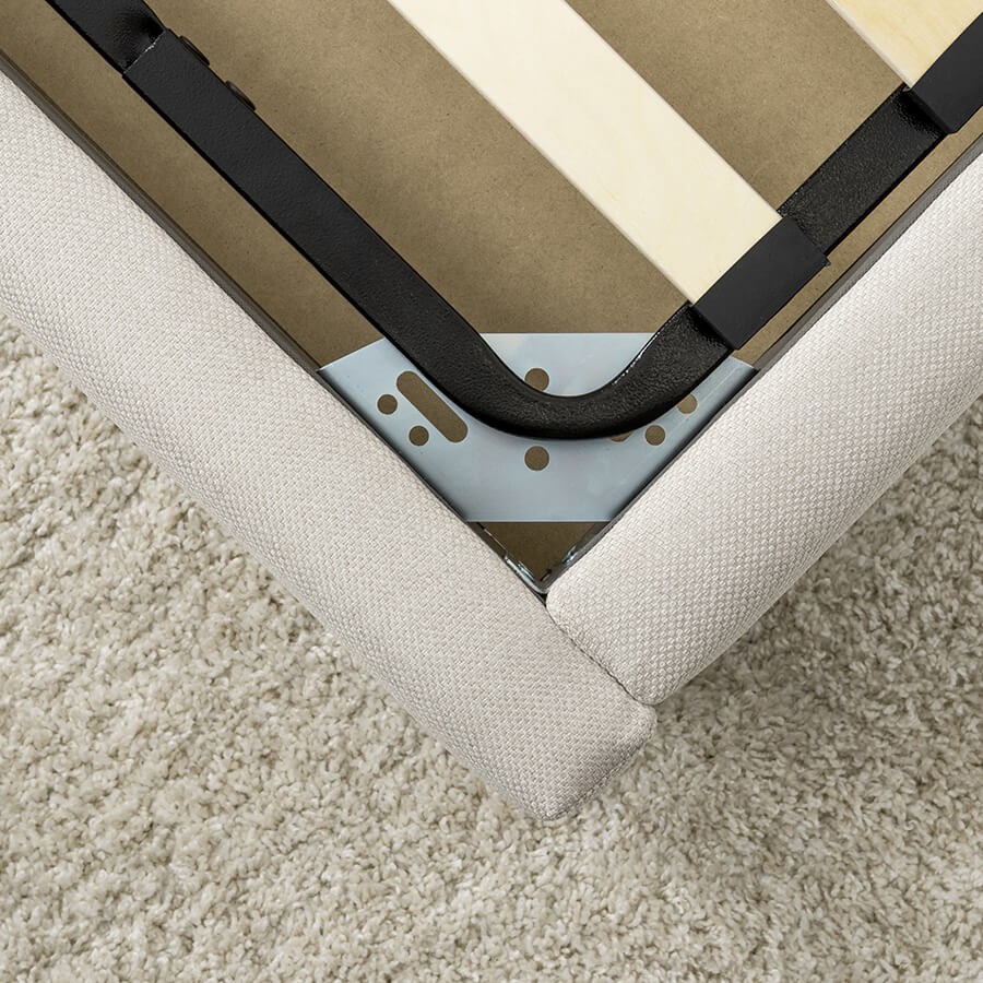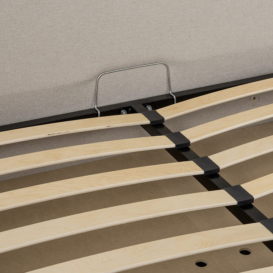 Основание кровати укомплектовано матрасодержателем. Жесткое кроватное дно из МДФ 6 мм. Задняя стенка изголовья выполнена в тех. ткани (спанбонд).
