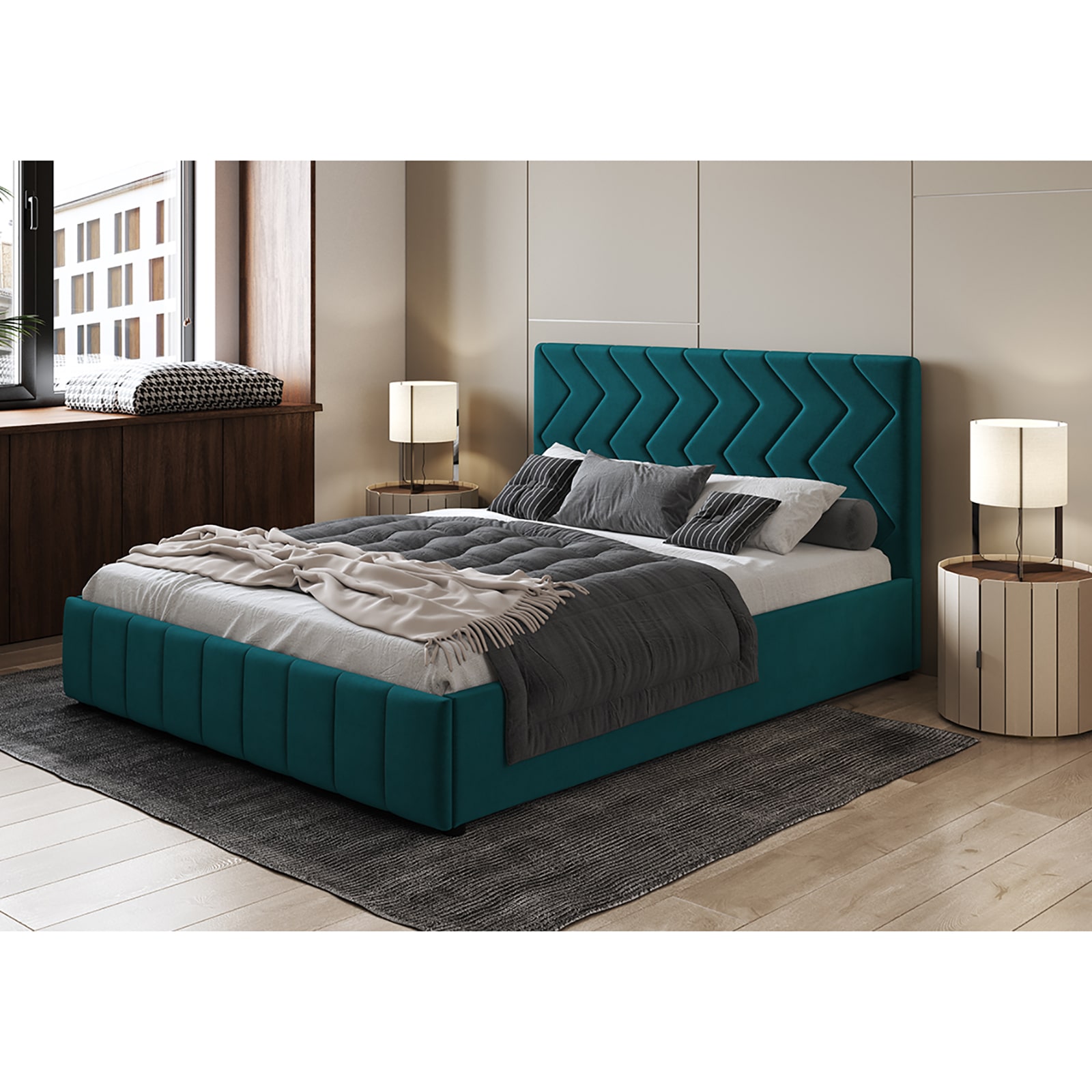 Интерьерная кровать МИЛАНА выполнена в благородном велюре, что подчеркивает объем и геометрию стежки.
