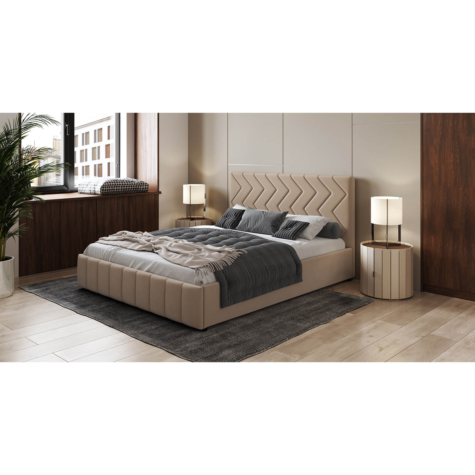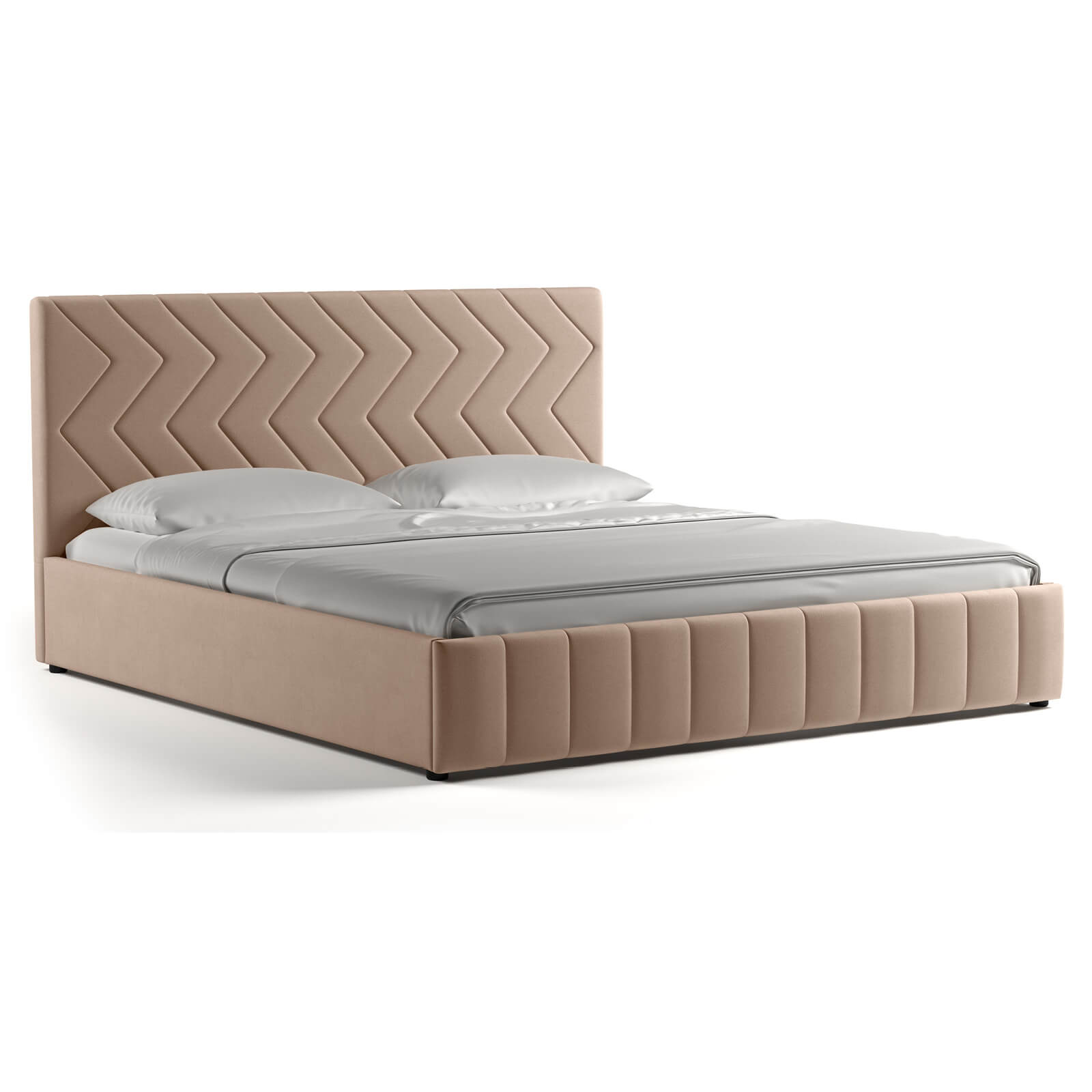 Интерьерная кровать МИЛАНА выполнена в благородном велюре, что подчеркивает объем и геометрию стежки.