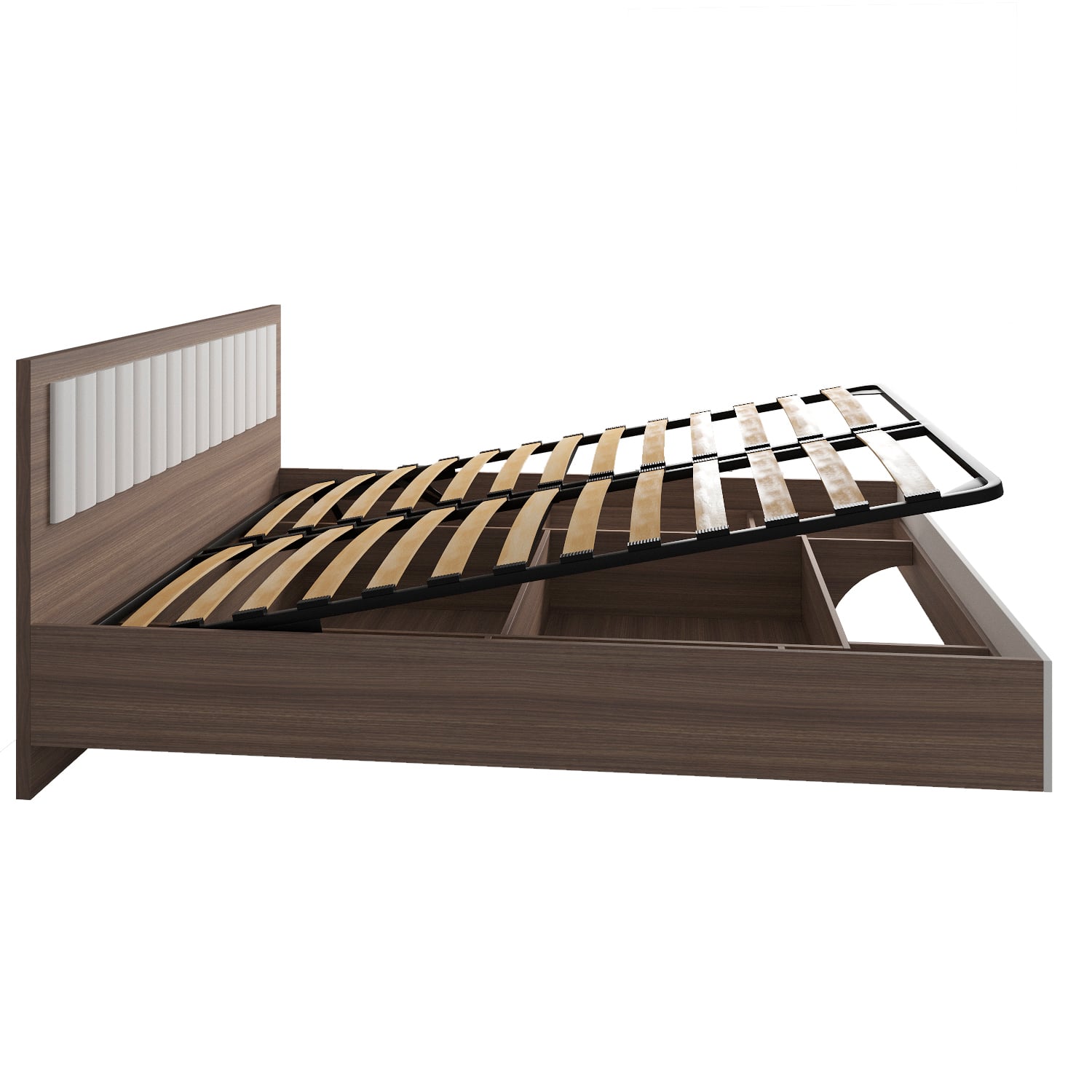Ортопедическое основание кровати установлено на газлифтах, что позволяет легко поднимать и опускать основание, а также использовать отсеки для хранения вещей. Отсеки находятся под кроватью и обеспечивают дополнительное пространство для хранения постельного белья, одежды, обуви и других вещей, что позволяет сэкономить место в комнате.