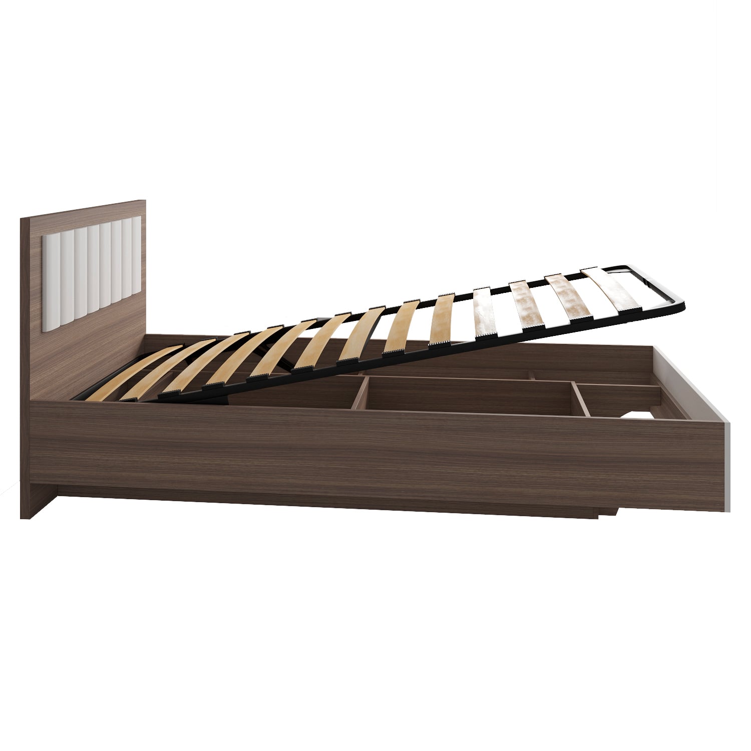 Ортопедическое основание кровати оснащено газлифтами, они обеспечивают легкость и удобство в открывании и закрывании механизма. Кровать имеет два отсека для хранения вещей, которые позволяют экономить место и удобно размещать различные предметы.