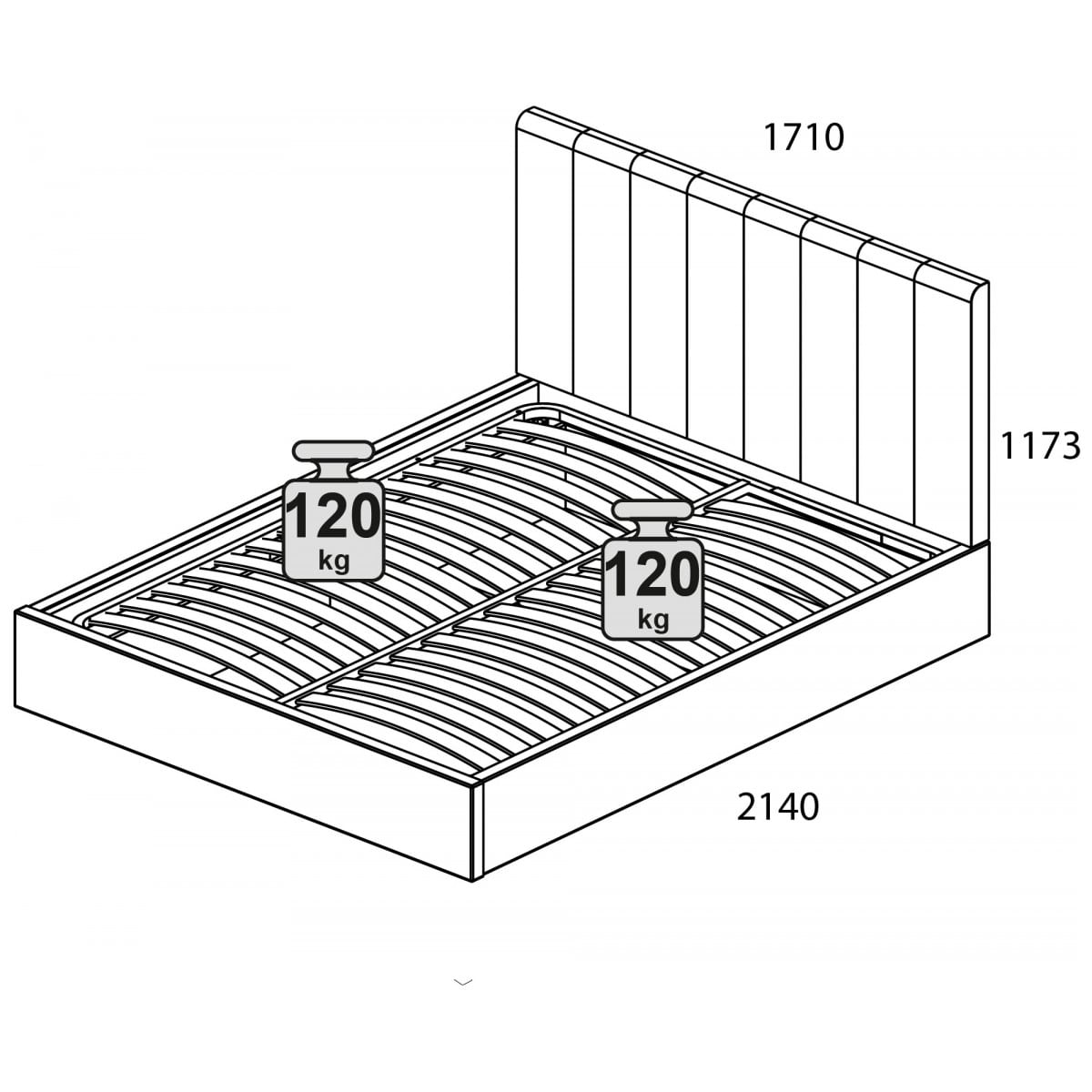 Размер спального места кровати 160 х 200 см. Рекомендуется использовать матрас высотой от 20 см. Максимальная нагрузка на одно спальное место составляет 120 кг