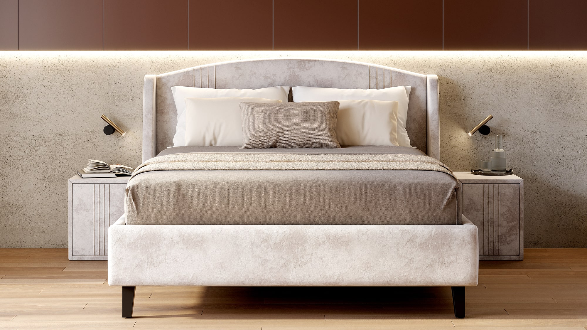 Каркас кровати обит мягким и приятным на ощупь велюром, который хорошо держит форму, устойчив к механическим воздействиям (в том числе к зацепкам от когтей животных), гипоаллергенен.