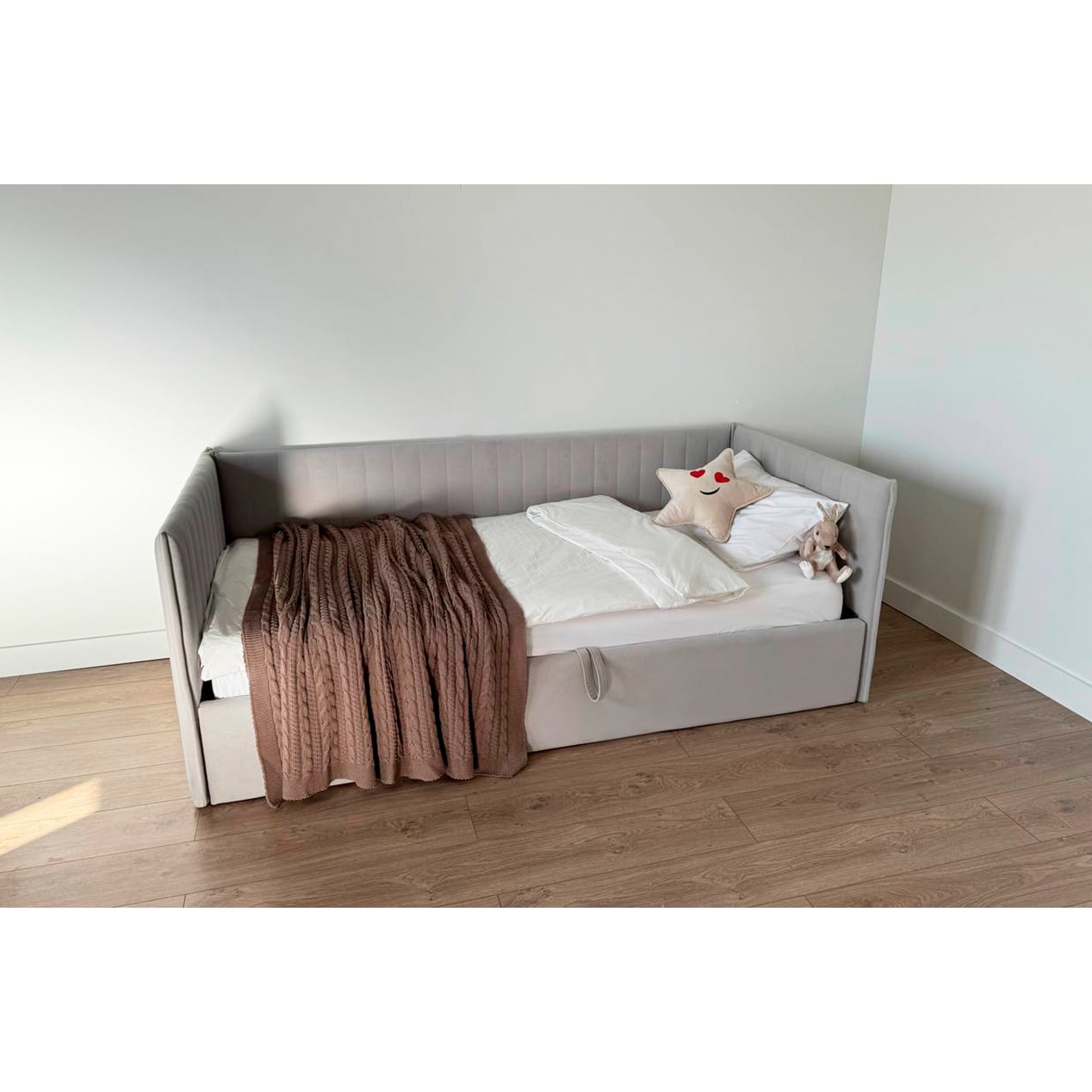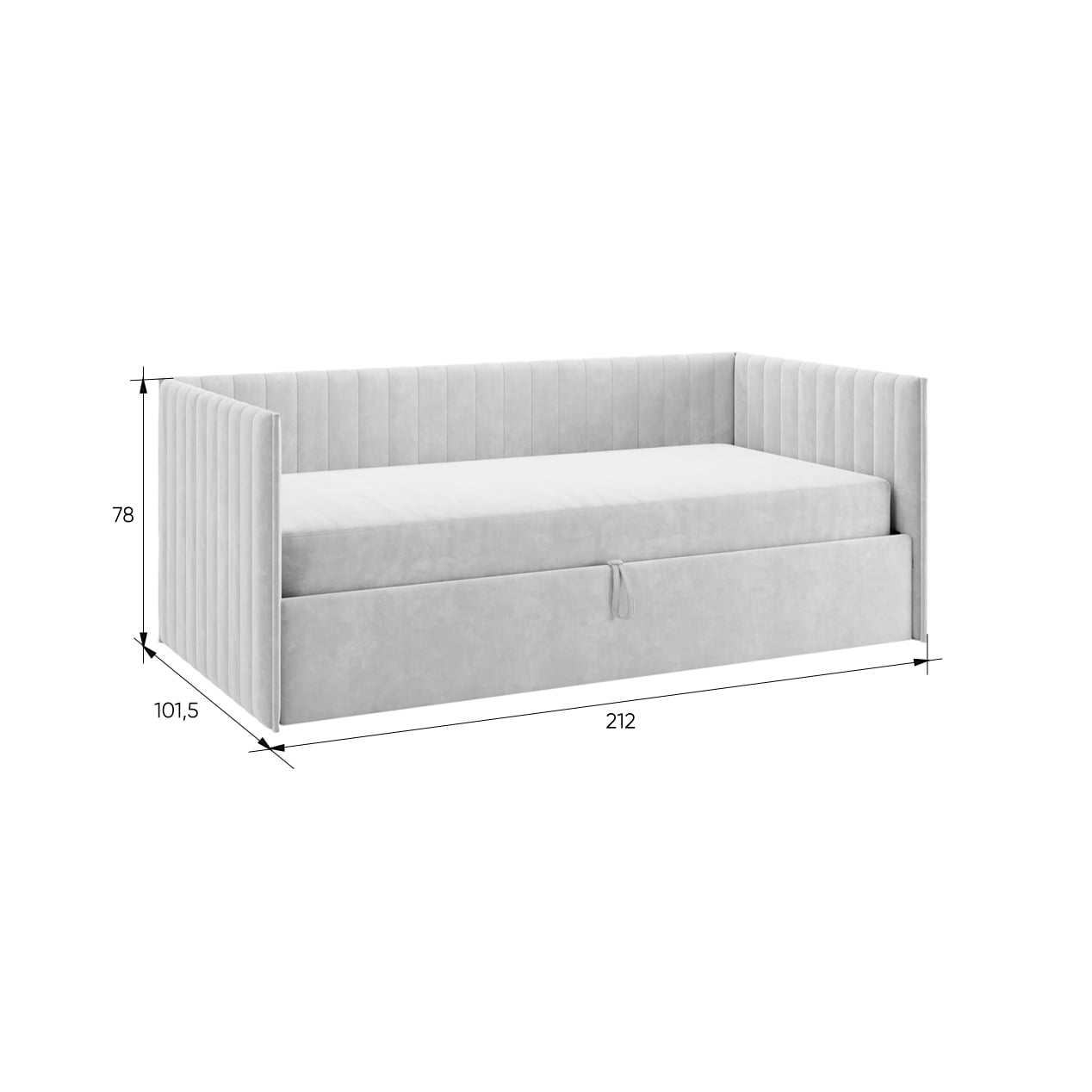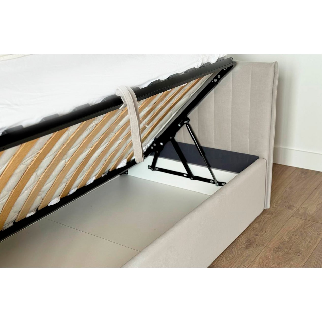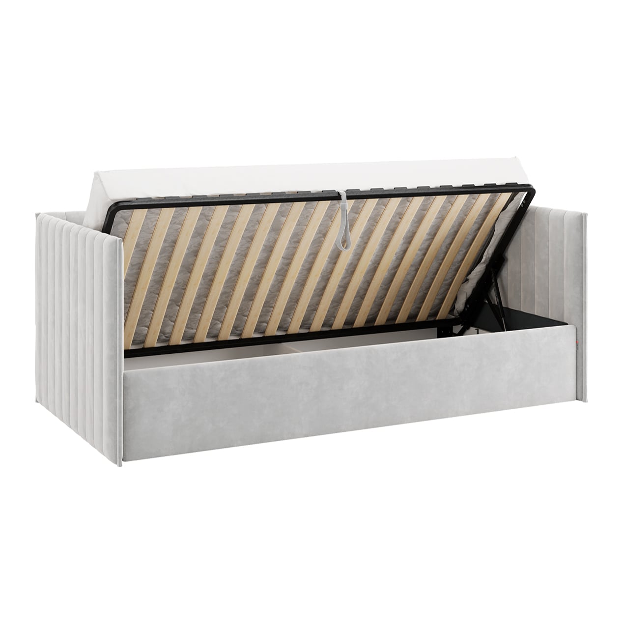 Подъемный механизм позволяет легко скрыть под матрасом дополнительное пространство для хранения вещей — идеально для хранения постельного белья, игрушек или сезонной одежды.