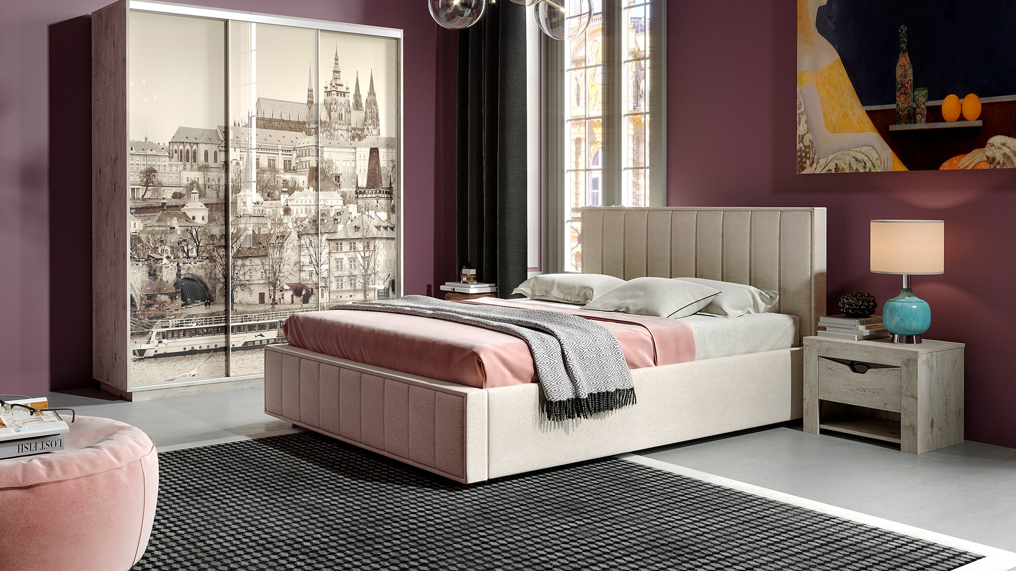 Кровать в мягкой обивке “Женева” является воплощением элегантной изысканности.