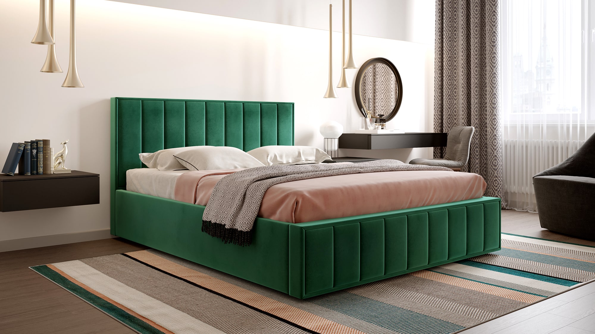 Кровать в мягкой обивке “Женева” является воплощением элегантной изысканности.