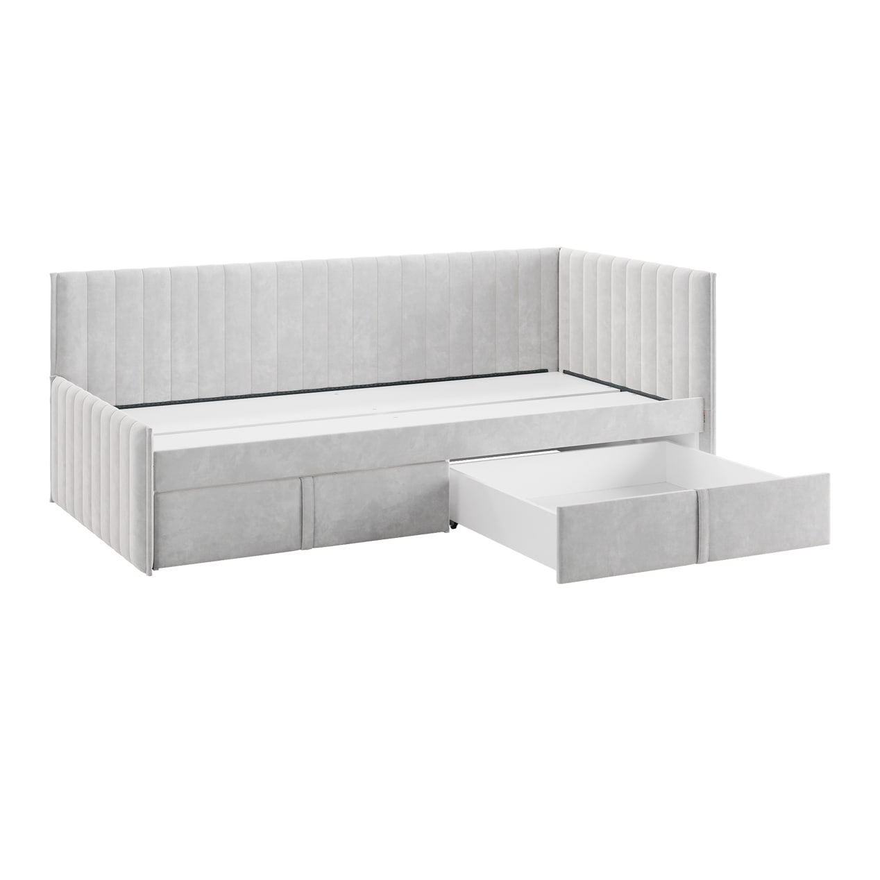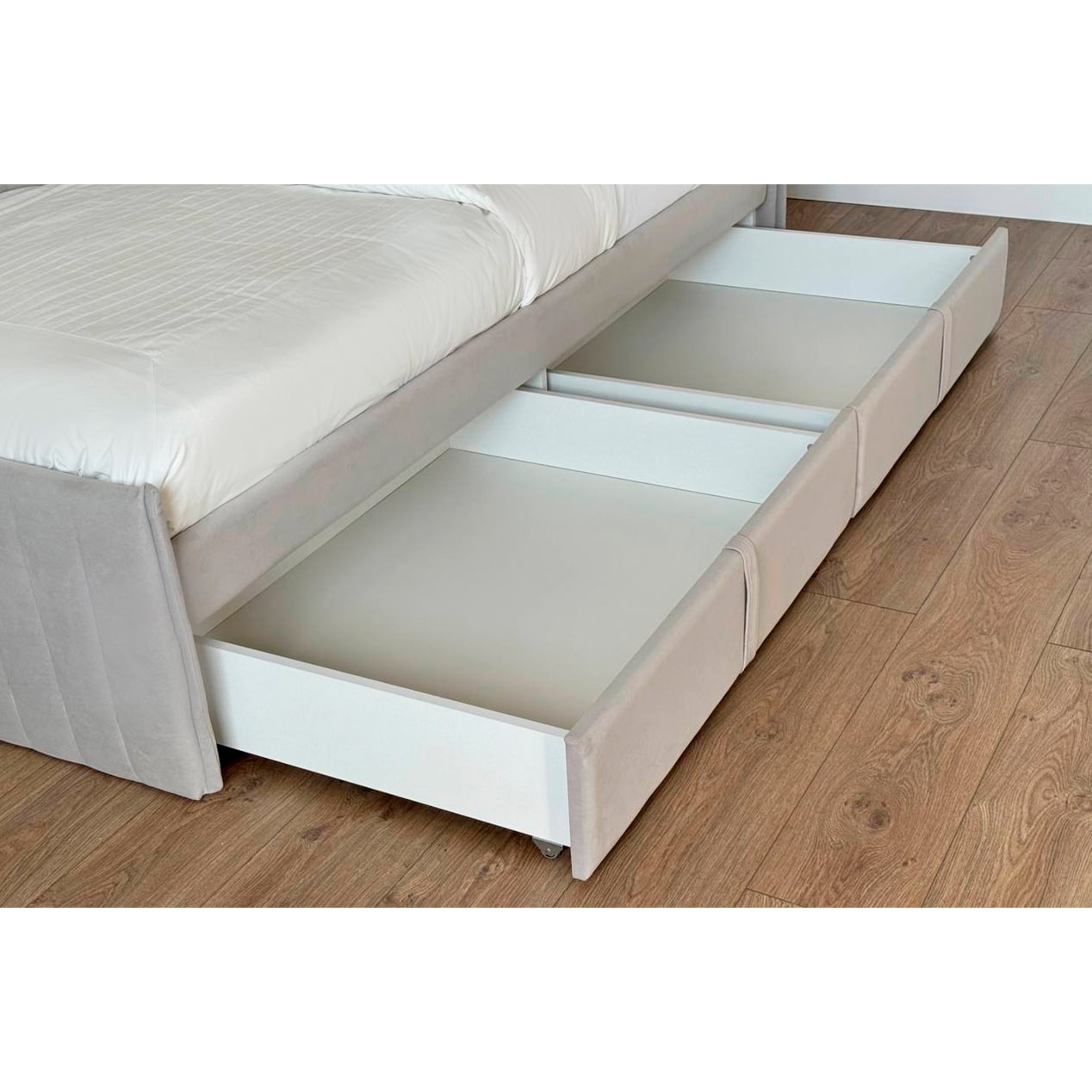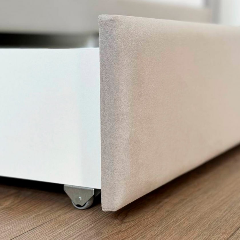 Вместительные выкатные ящики предоставляют дополнительные возможности для хранения постельного белья, одежды или других важных вещей, что особенно актуально для небольших помещений. Настил из ЛДСП гарантирует удобство и надежность использования.
