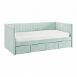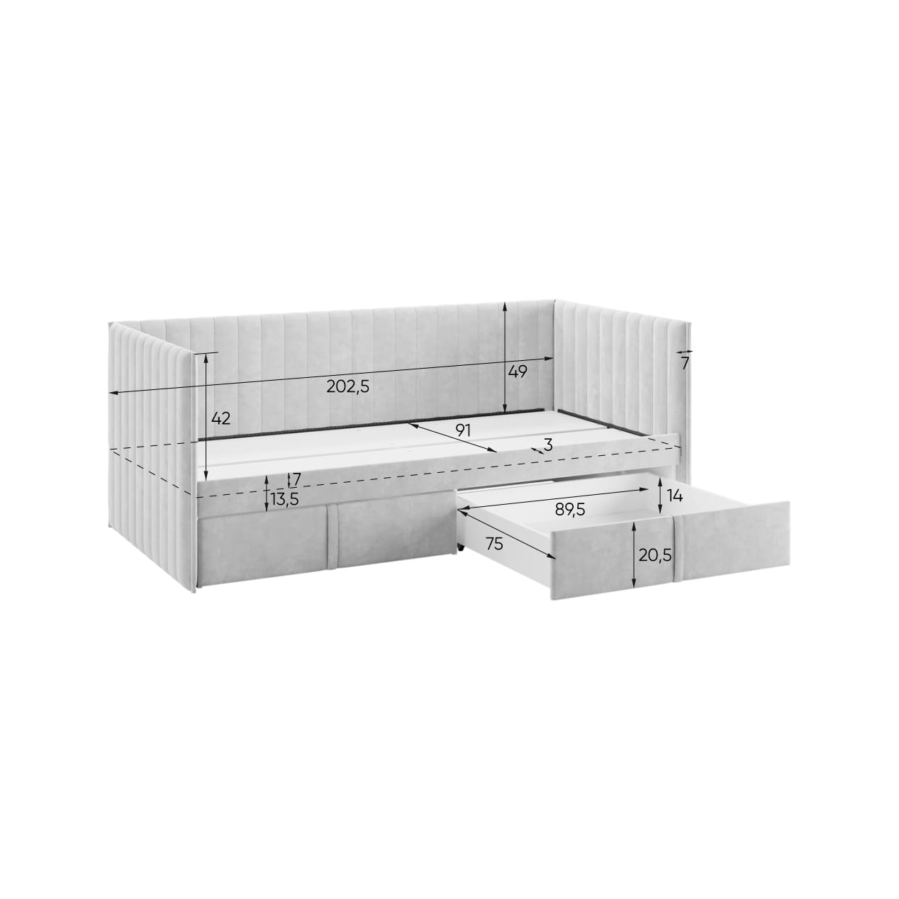 Кровать с ящиками Твикс (Софа) 90х200 см – это идеальное решение для компактного и функционального обустройства спальни или детской комнаты. Изготовленная из высококачественных материалов, таких как ДСП толщиной 16 мм, мягкого наполнителя и велюра, она сочетает в себе современный дизайн и практичность.