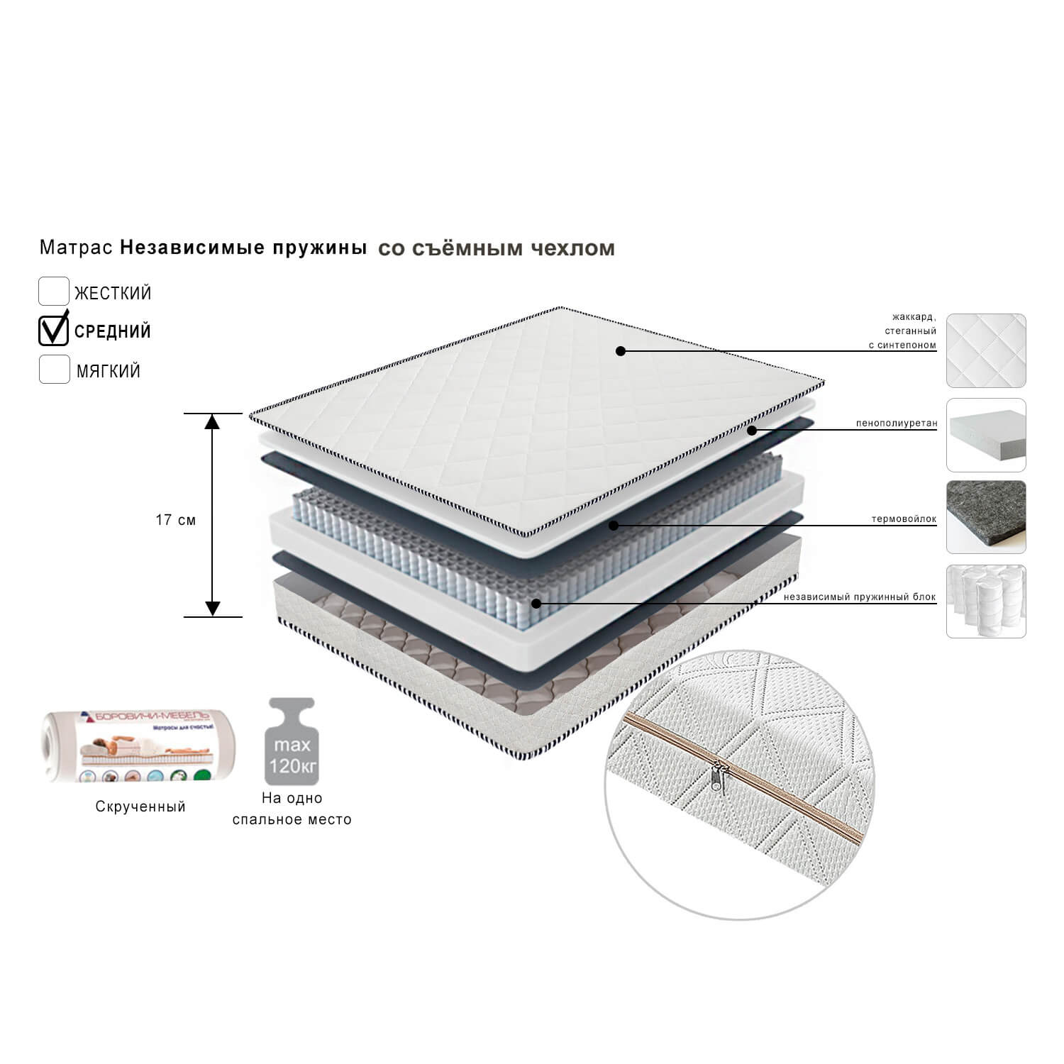 Блок независимых пружин: пружины в блоке имеют форму бочонка и находятся в отдельном пакете, который заключен в отдельные пакеты из файбертекса, засчет этого пружины работают независимо друг от друга, что придает матрасу ортопедический эффект.