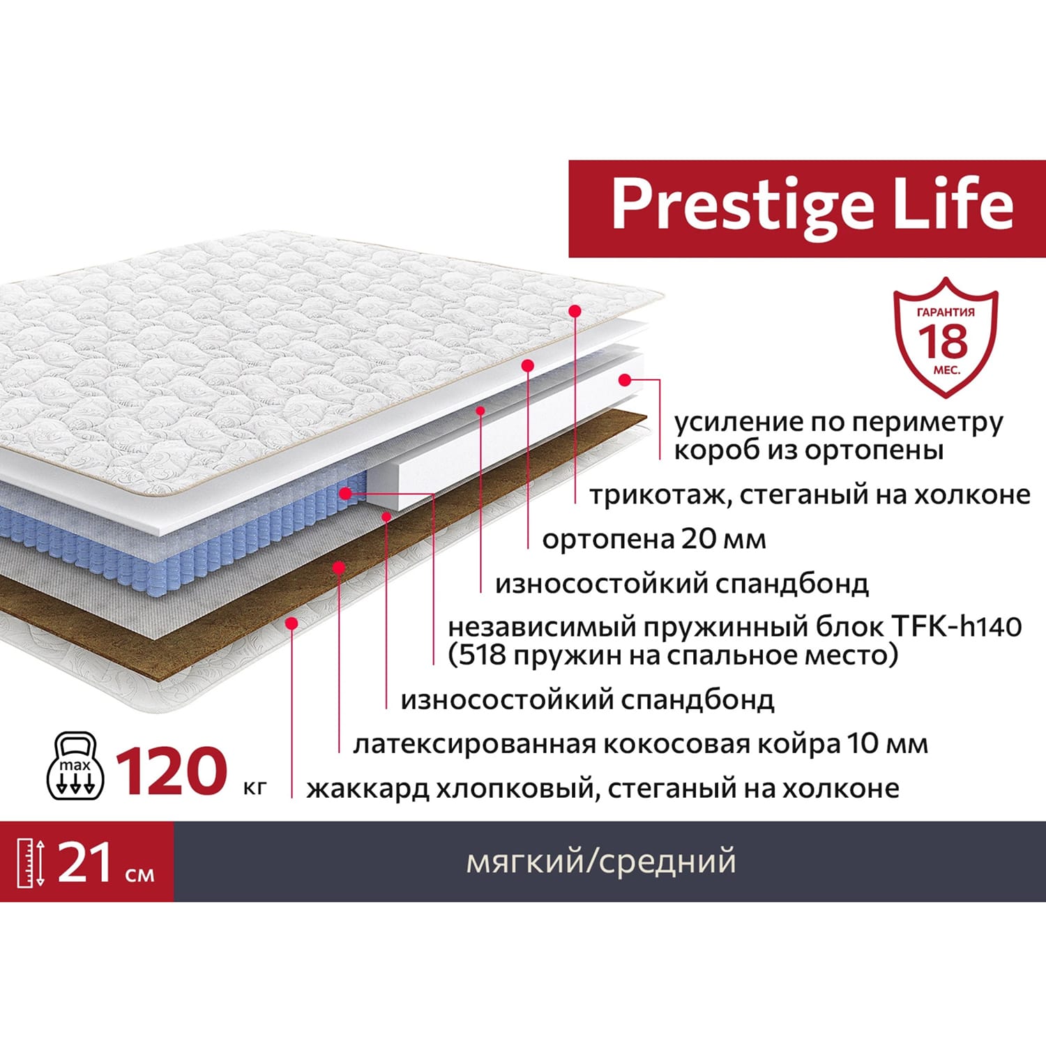 В модели Prestige Life (зима-лето) используются разные наполнители и материалы: для теплой, зимней стороны – мягкая ортопена и трикотаж, который идеально сохраняет тепло; для холодной, летней – латексированная кокосовая койра и прохладный на ощупь жаккард, отличающийся долговечностью и прочностью. Для простоты “опознания” стороны на матрасе есть символы “снежинка” и “солнышко”.