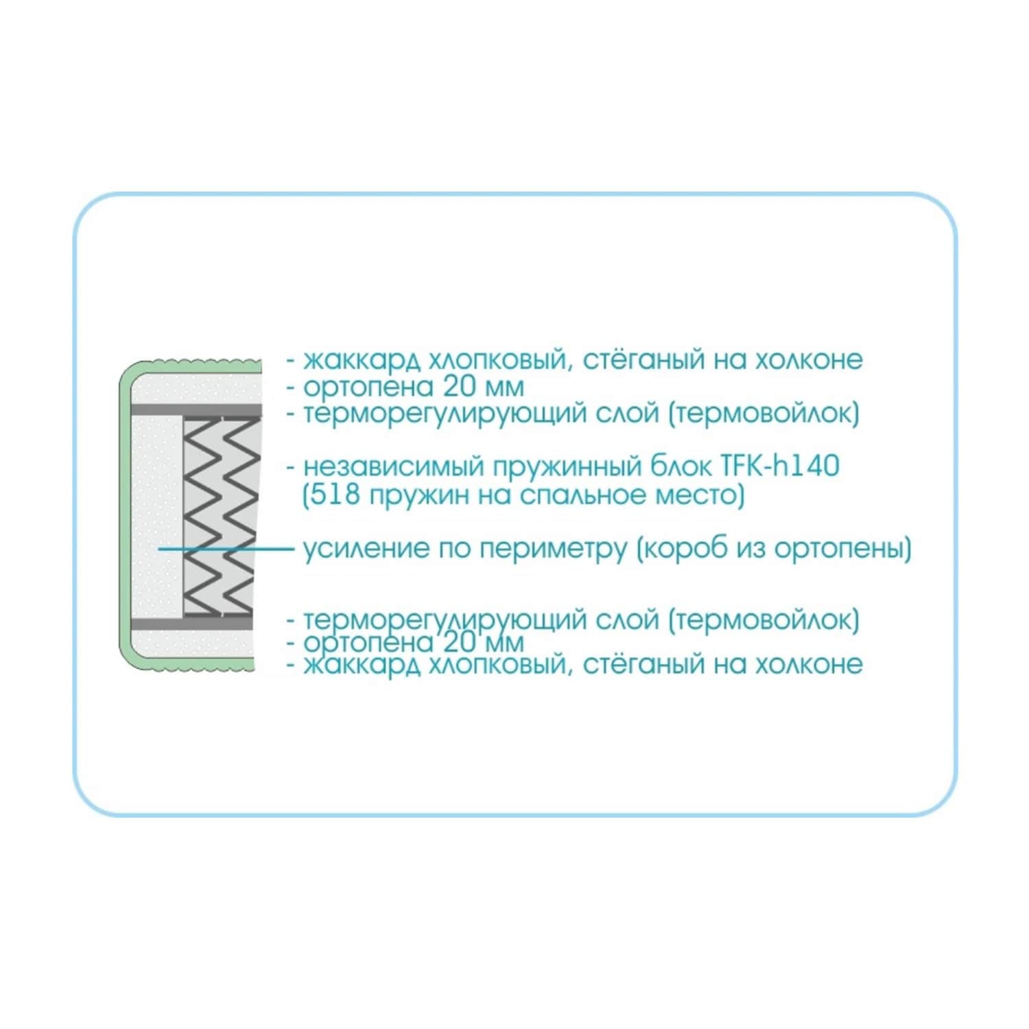 Прочный терморегулирующий слой устойчив к истиранию, что существенно продлевает срок службы изделия. Слой упругой ортопены улучшает анатомические свойства матраса, повторяя контуры тела спящего. Вы прекрасно выспитесь и утром будете чувствовать себя отлично!