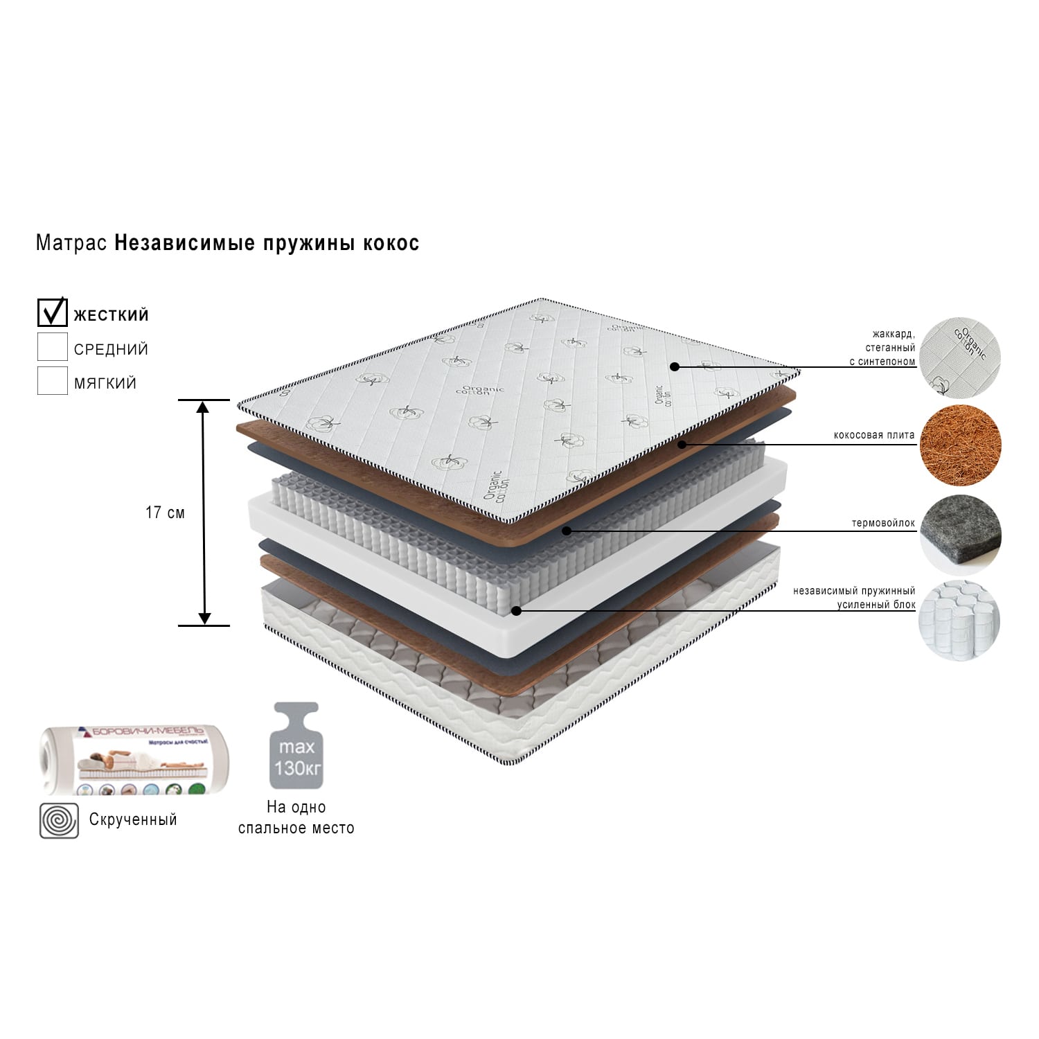 Блок независимых пружин: пружины в блоке имеют форму бочонка и находятся в отдельном пакете, который заключен в отдельные пакеты из файбертекса, засчет этого пружины работают независимо друг от друга, что придает матрасу ортопедический эффект.