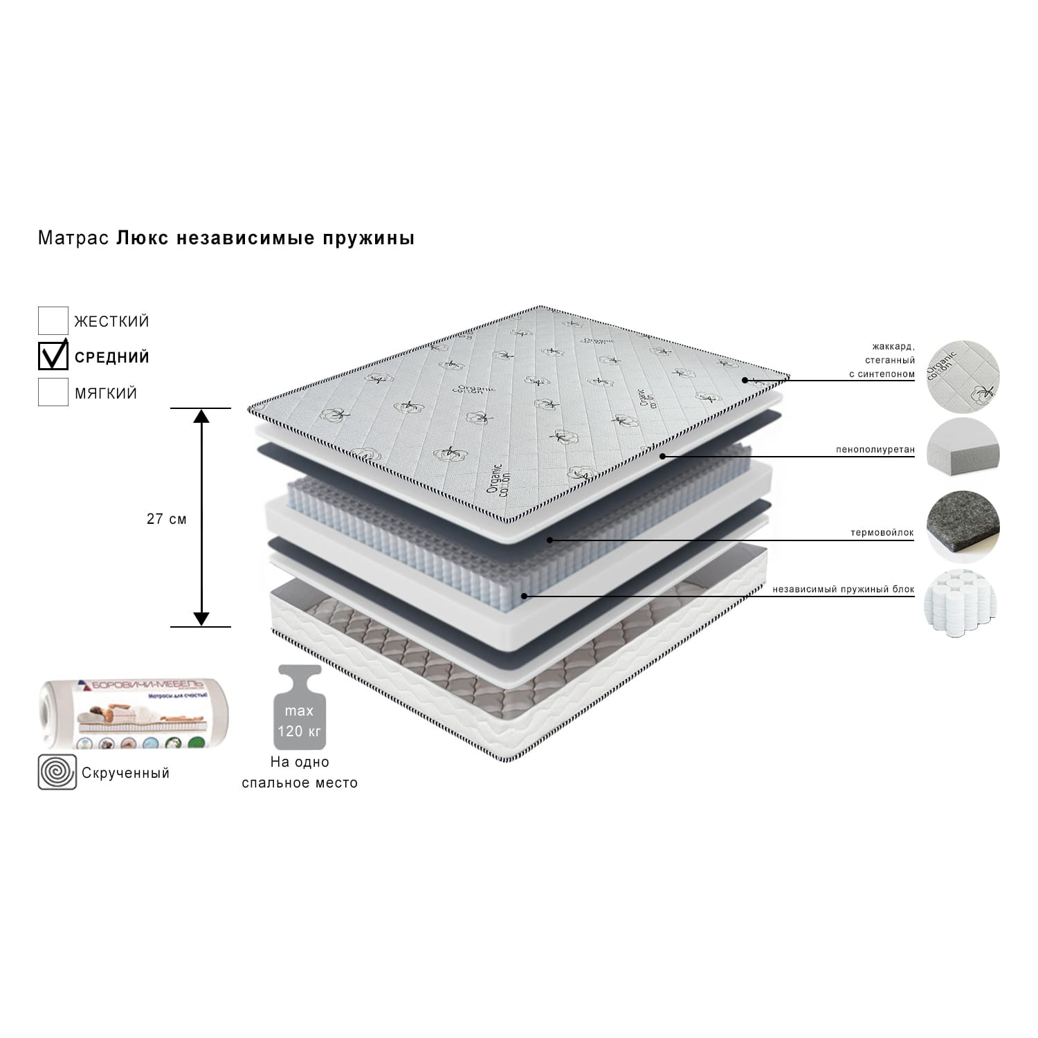Блок независимых пружин: пружины в блоке имеют форму бочонка и находятся в отдельном пакете, который заключен в отдельные пакеты из файбертекса, засчет этого пружины работают независимо друг от друга, что придает матрасу ортопедический эффект.