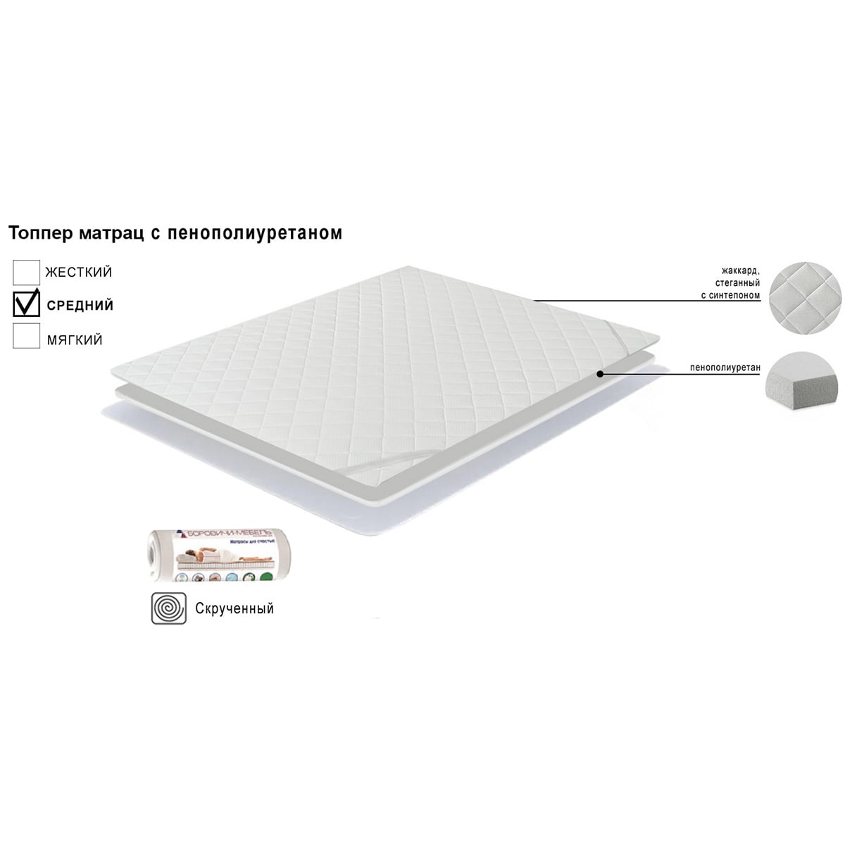 Основу наматрасника составляет пенополиуретан - эластичный, мягкий материал.Придает спальной поверхности умеренную мягкость.