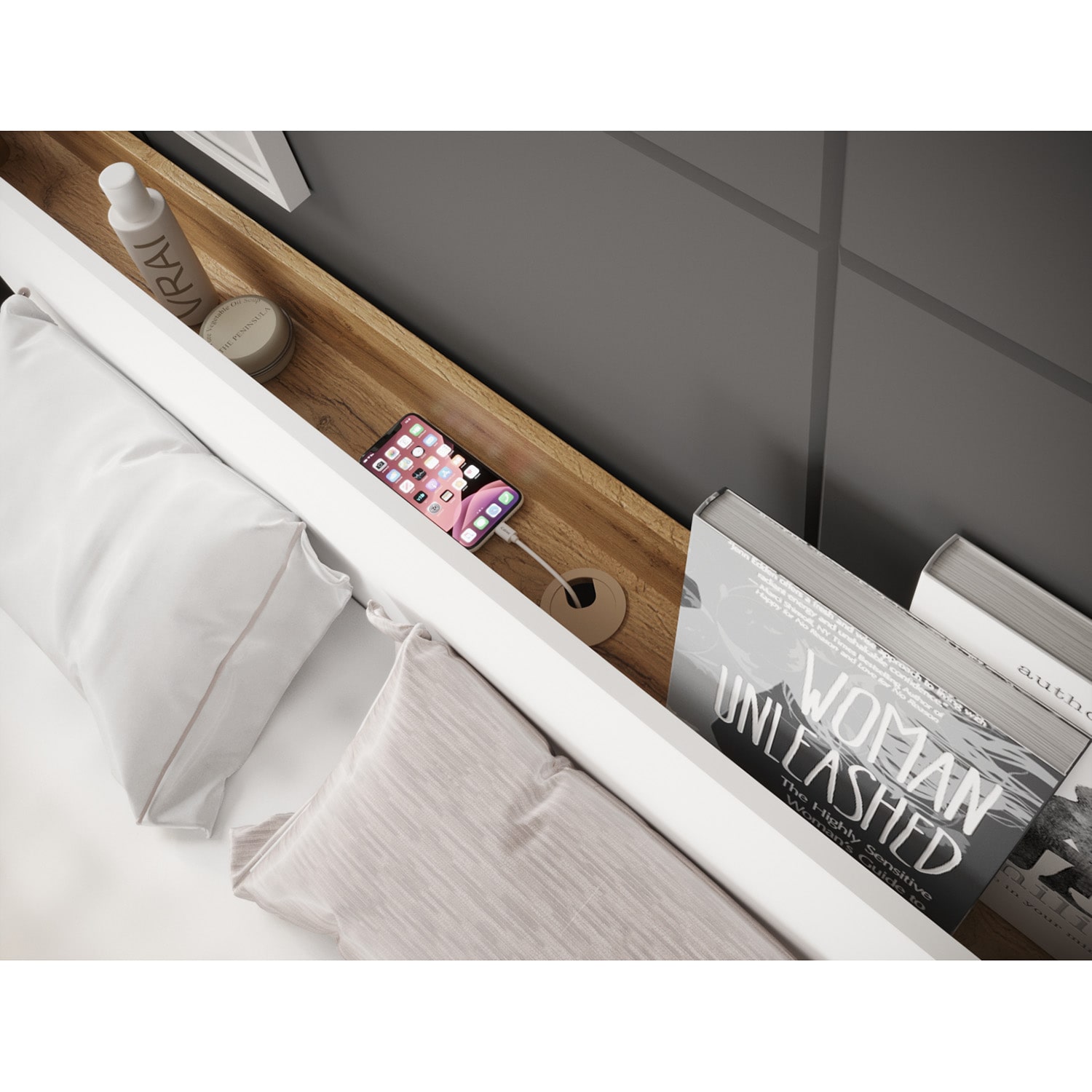 Вместительный короб для вещей, а изголовье можно как полку использовать.