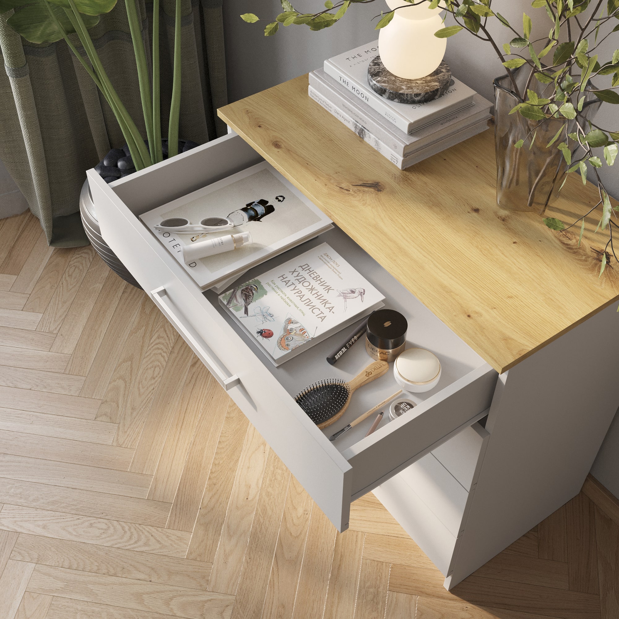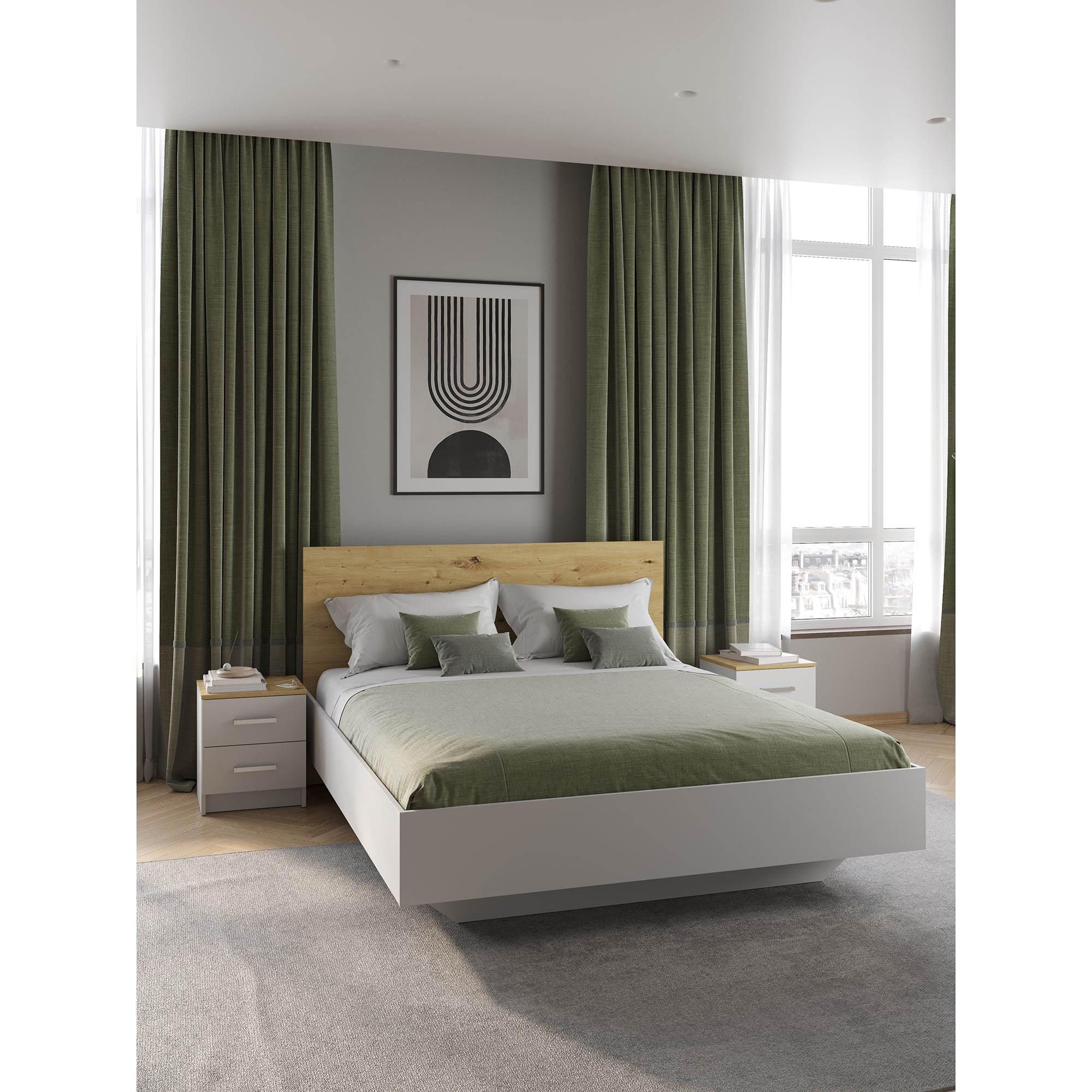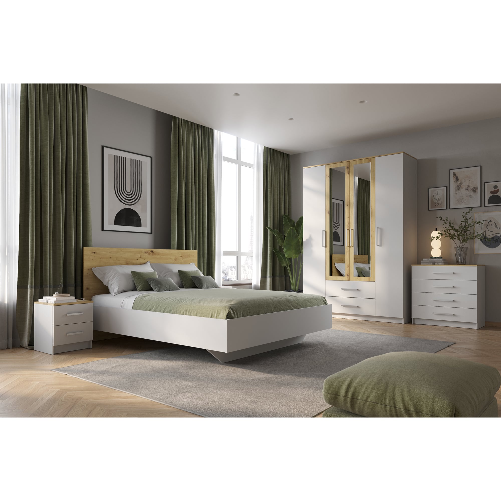 В комплект мебели входят: Шкаф 4-х дверный (1602х2350х543 мм) Комод (822х810х440 мм) Тумба прикроватная (400х464х375 мм ) - 2 шт Кровать (1734х970х2032 мм/ спальное место 1600х2000 мм)