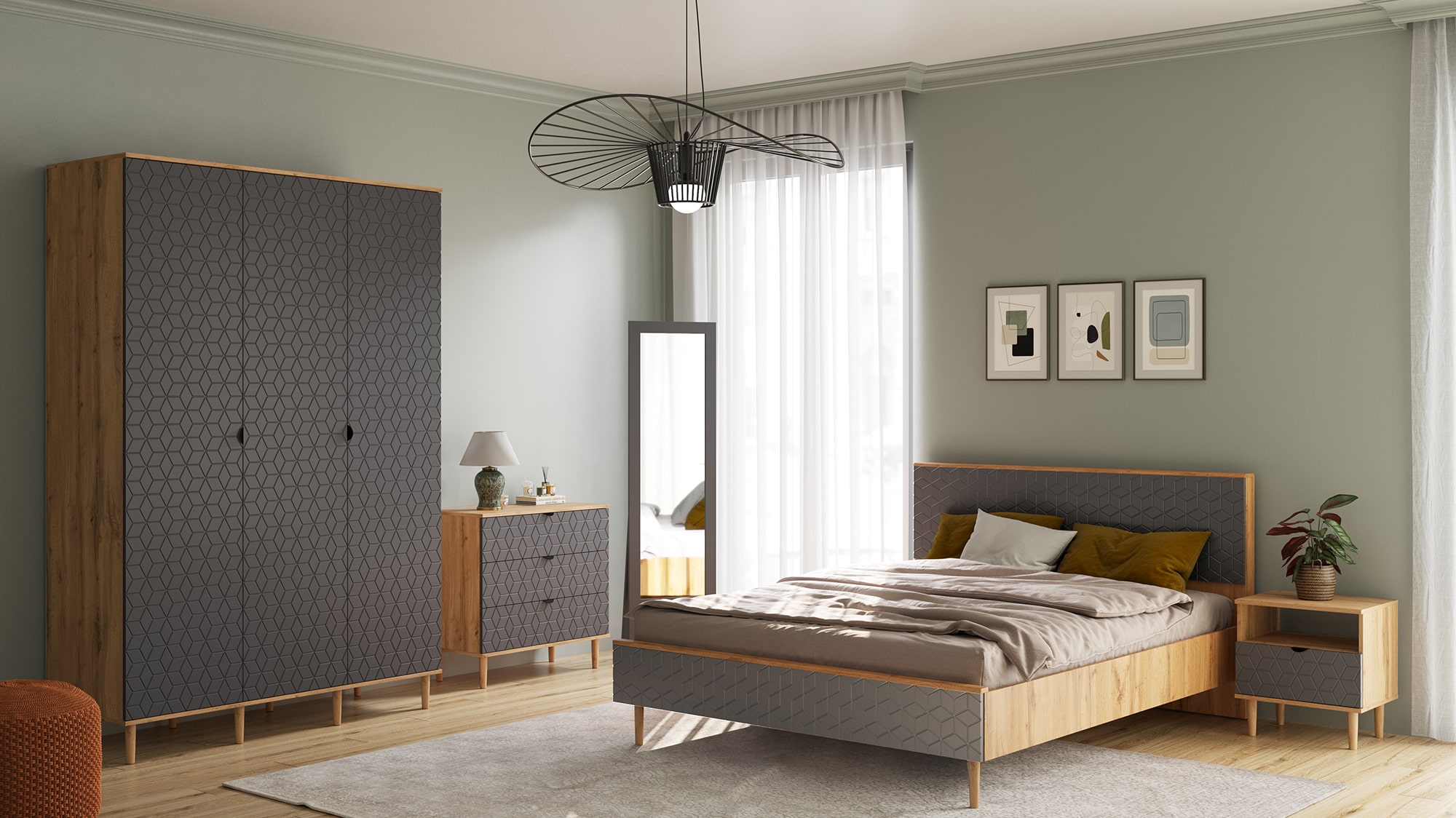 Спальный гарнитур “Денвер” — это изысканное и стильное решение для обустройства вашей спальни. Отличительной особенностью данной коллекции является изящная фрезеровка на фасадах в виде кубов, придающая им неповторимый шарм и элегантность.