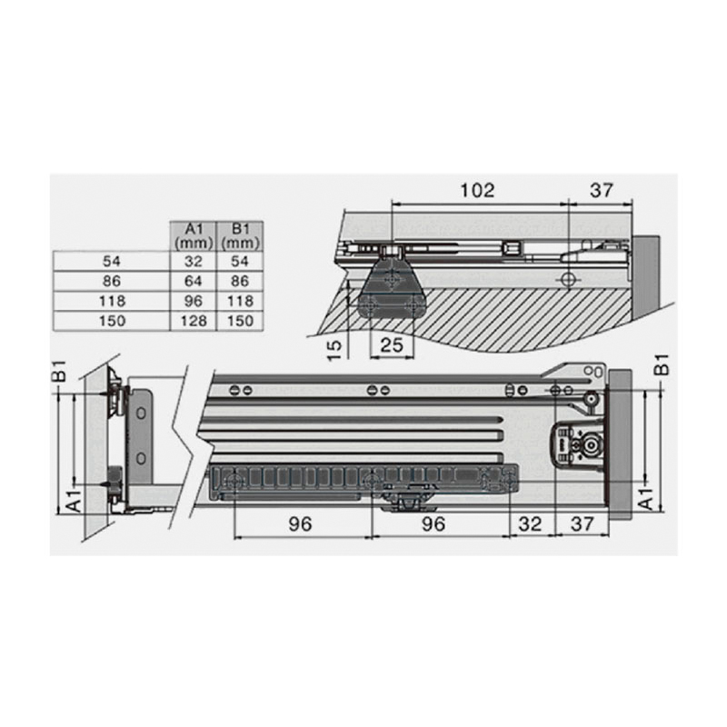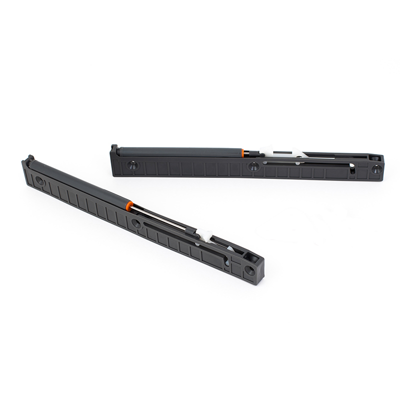 Доводчик плавного закрывания ящика устанавливается на боковины модуля, ответные части крепятся под днище ящика