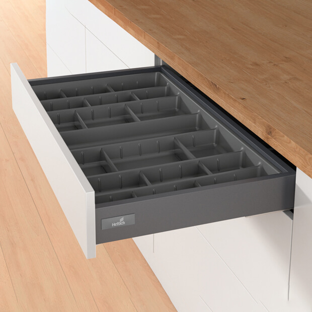 Для стандартной ширины корпуса Пластик, цвет антрацит Состав комплекта: 1 пластиковый лоток для столовых приборов.