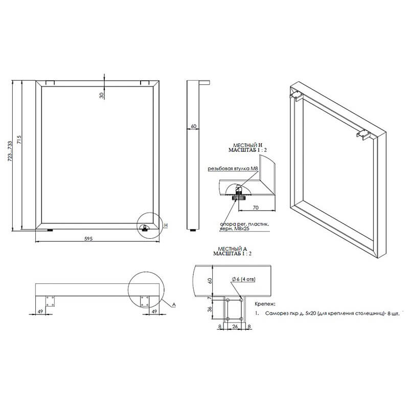 Опора для стола П-образная, 30х60, 725x595+5мм, усиленная, черный матовый (RAL9004)