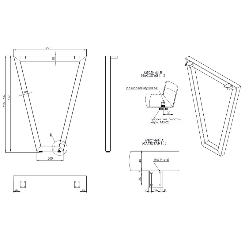 Опора для стола V-образная, 40х40, 725x550х200+5мм, усиленная, черный матовый (RAL9004)