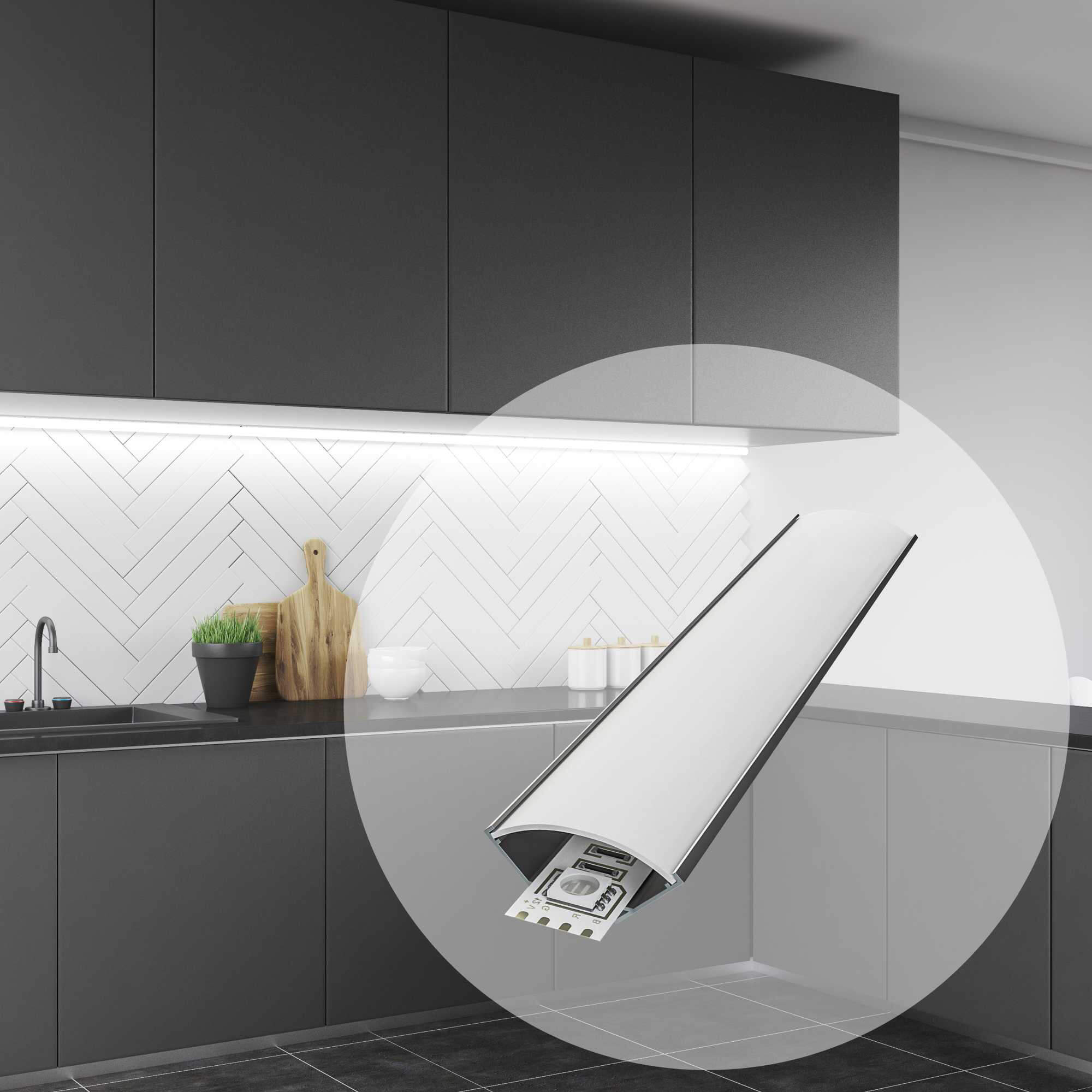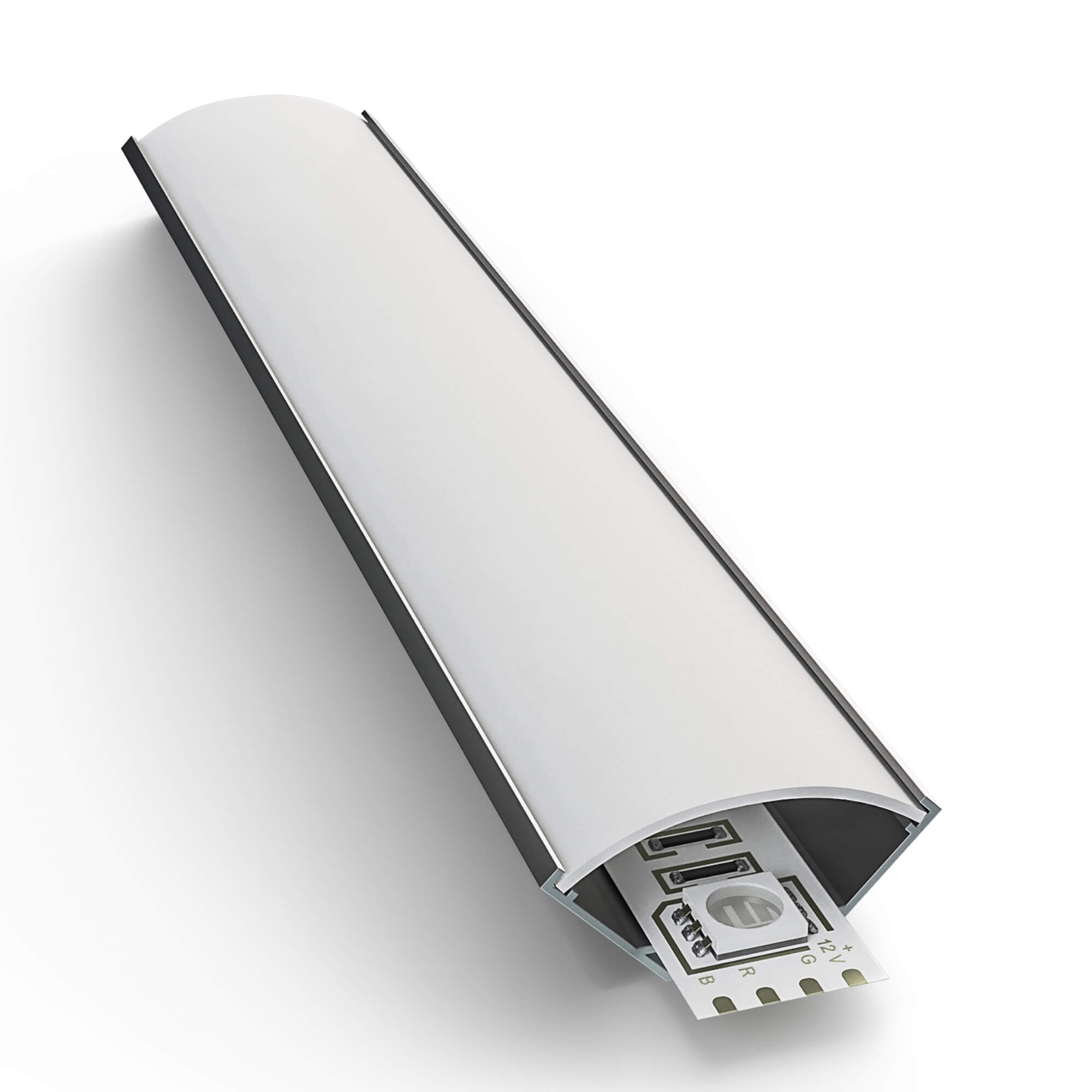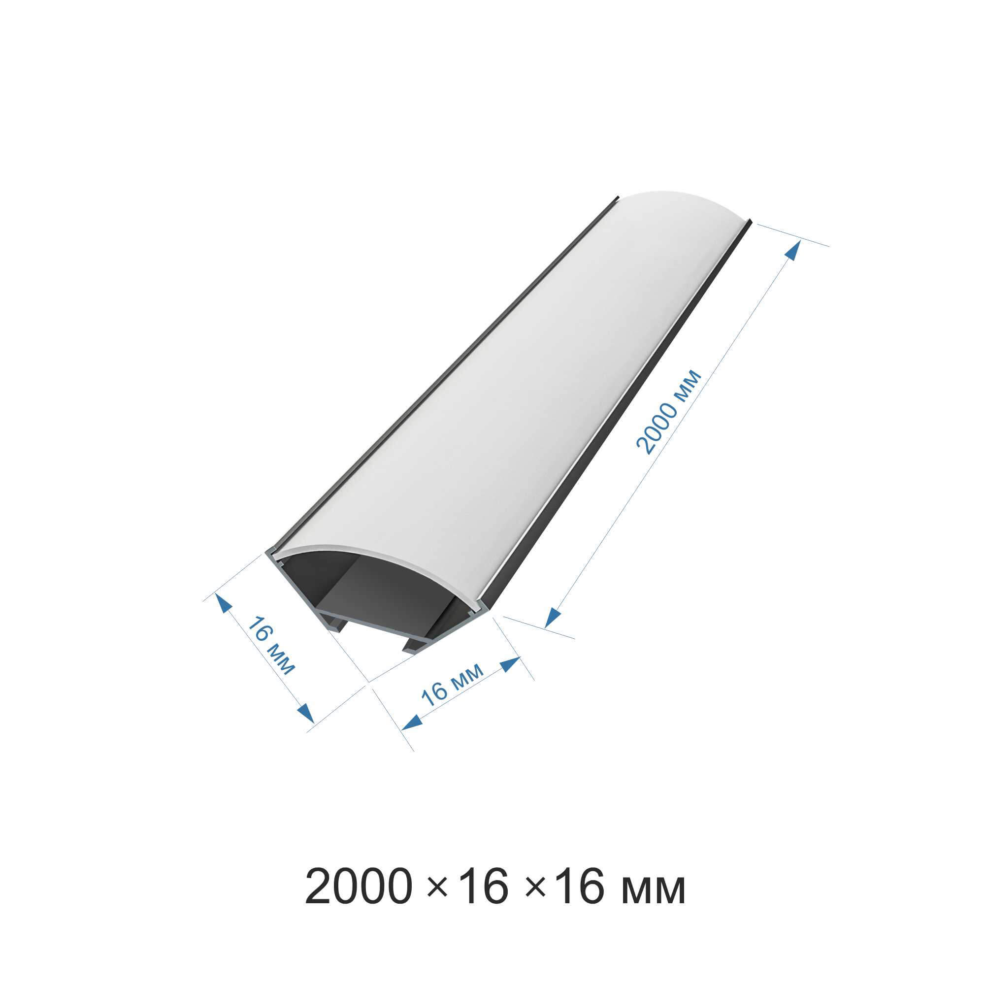 08-04 Профиль алюминиевый для светодиодной ленты, анод., угловой с широким рассеивателем, накладной, серебро, 16х16мм, 2м, шир. ленты до 10мм, индивидуальная упаковка (рассеиватель белый матовый, заглушки - 2шт.).