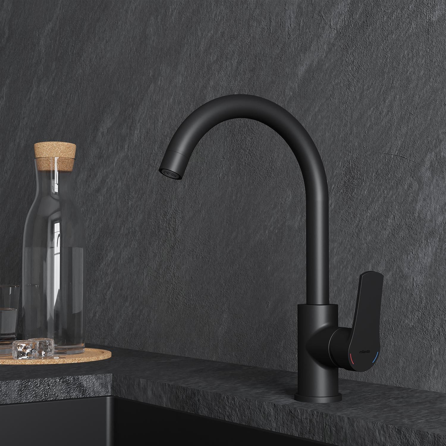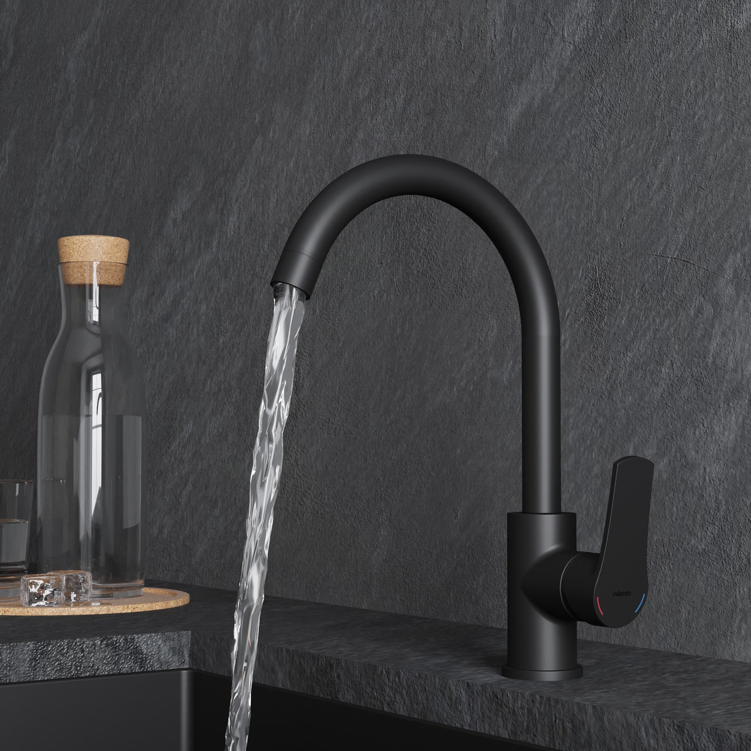 Смеситель для кухни, однозахватный, латунь, электрофоретическое покрытие, цвет - черный матовый, керамический картридж 35 мм, пластиковый аэратор. В комлекте: гибкая подводка, крепёж. Упаковка: коробка, микрогофрокартон, индивид. мешок.