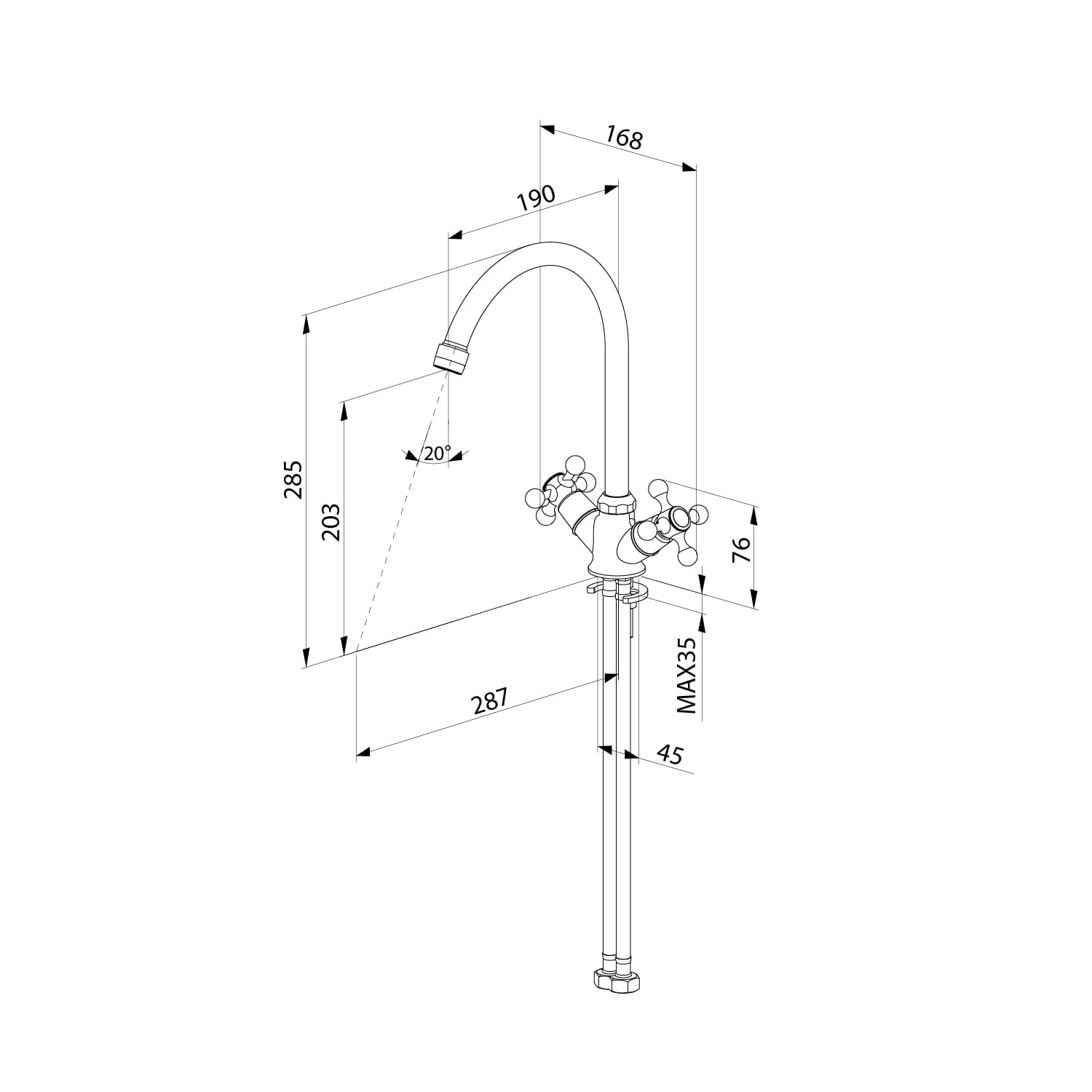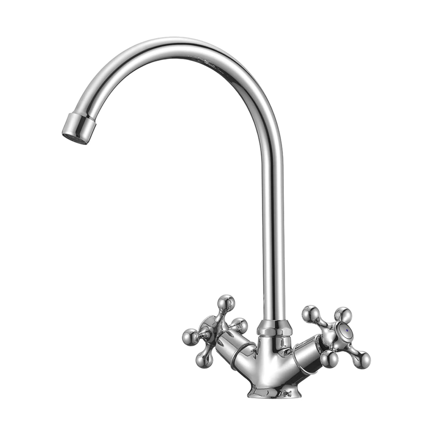 Смеситель для кухни, двухзахватный, латунь,никель-хромовое покрытие, цвет - хром, керамические кранбуксы, пластиковый аэратор. В комлекте: гибкая подводка, крепёж. Упаковка: коробка, микрогофрокартон, индивид. мешок.