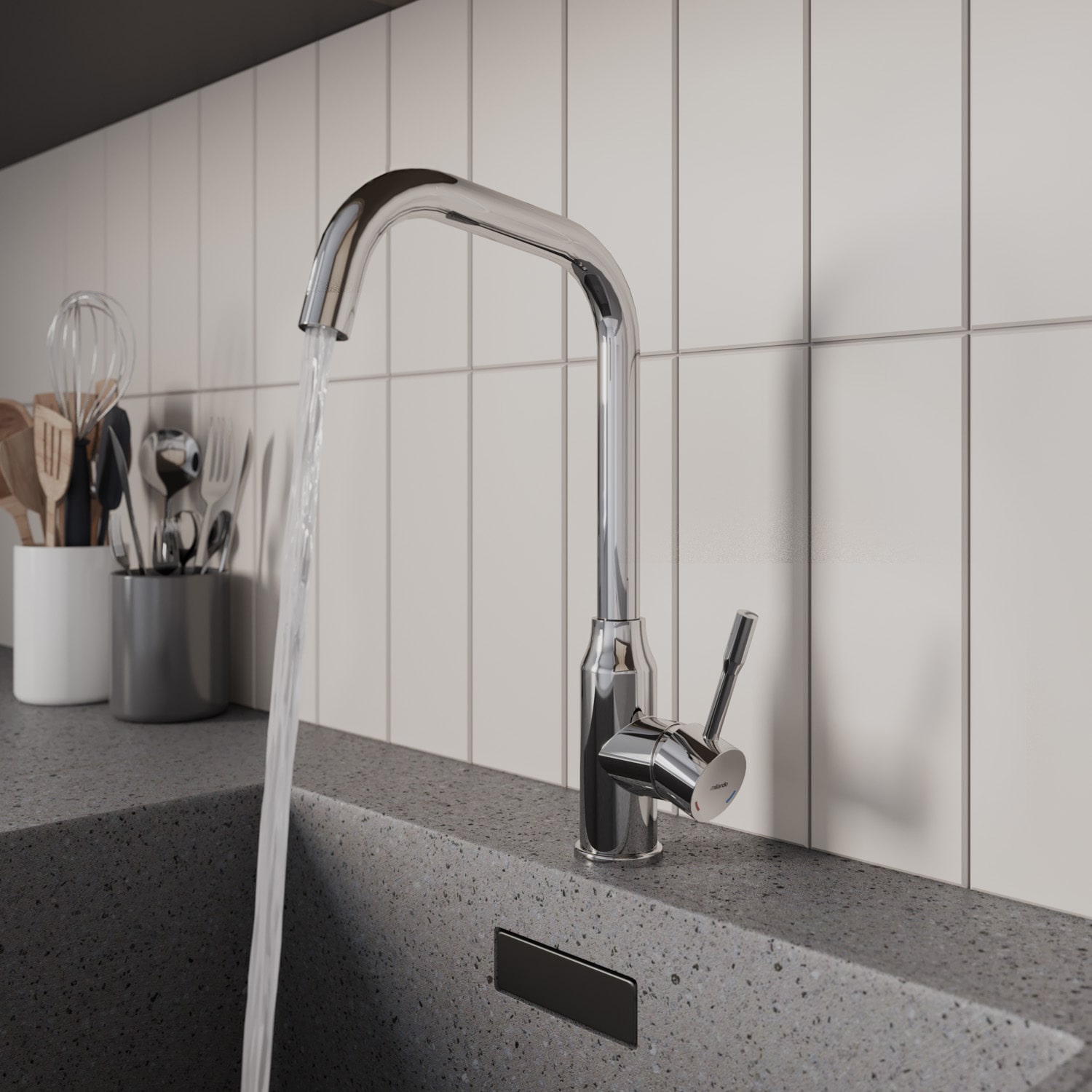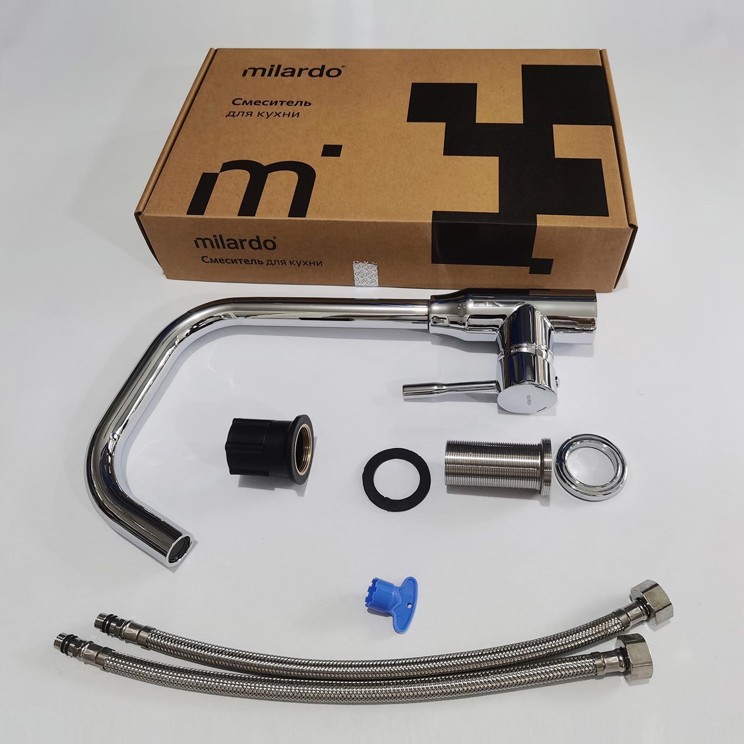 Смеситель для кухни, однозахватный, латунь, никель-хромовое покрытие, керамический картридж 35 мм, пластиковый аэратор. В комлекте: гибкая подводка, крепёж. Упаковка: коробка, микрогофрокартон, индивид. мешок.