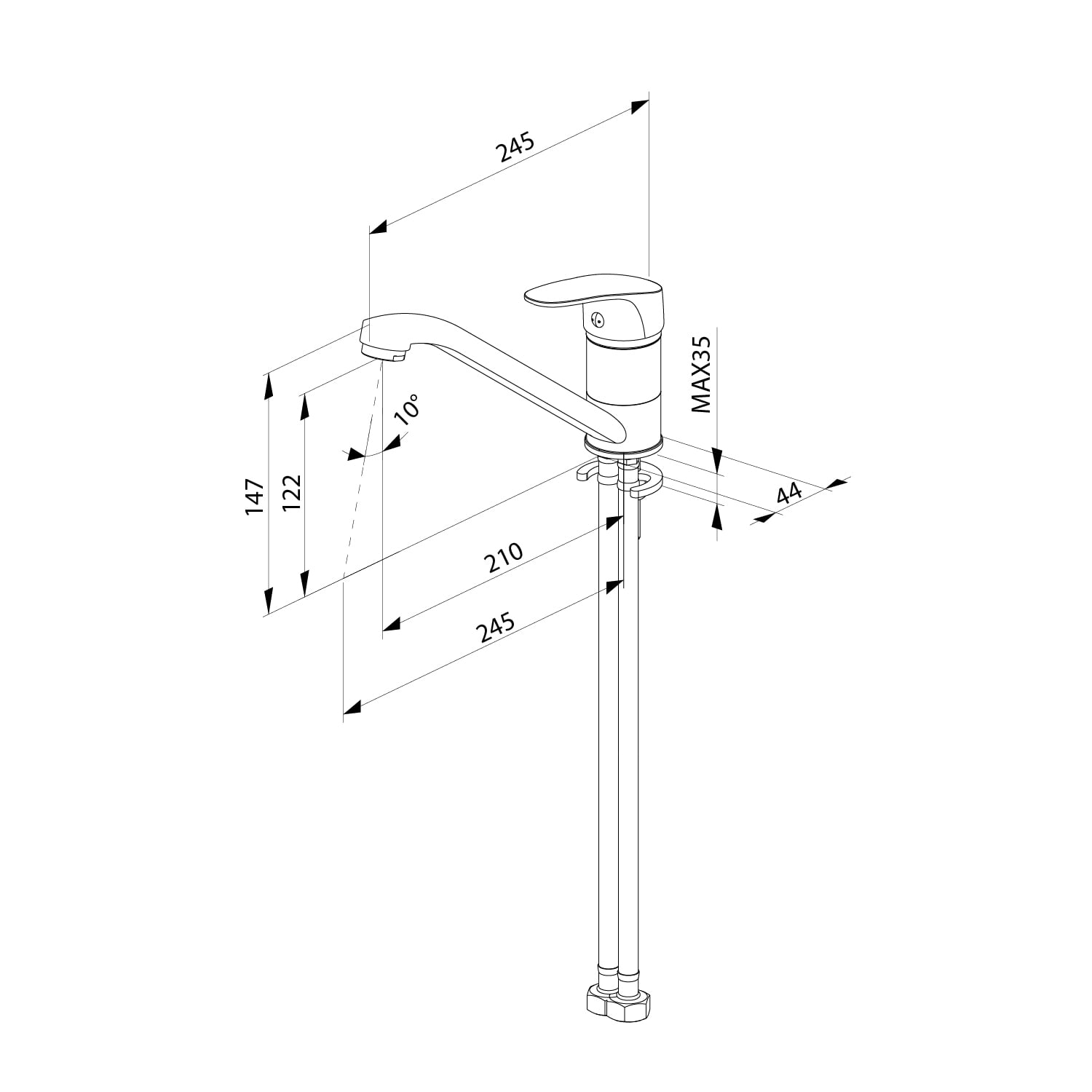Смеситель для кухни, однозахватный, латунь,никель-хромовое покрытие, цвет - хром, керамический картридж 35 мм, пластиковый аэратор. В комлекте: гибкая подводка, крепёж. Упаковка: коробка, микрогофрокартон, индивид. мешок.