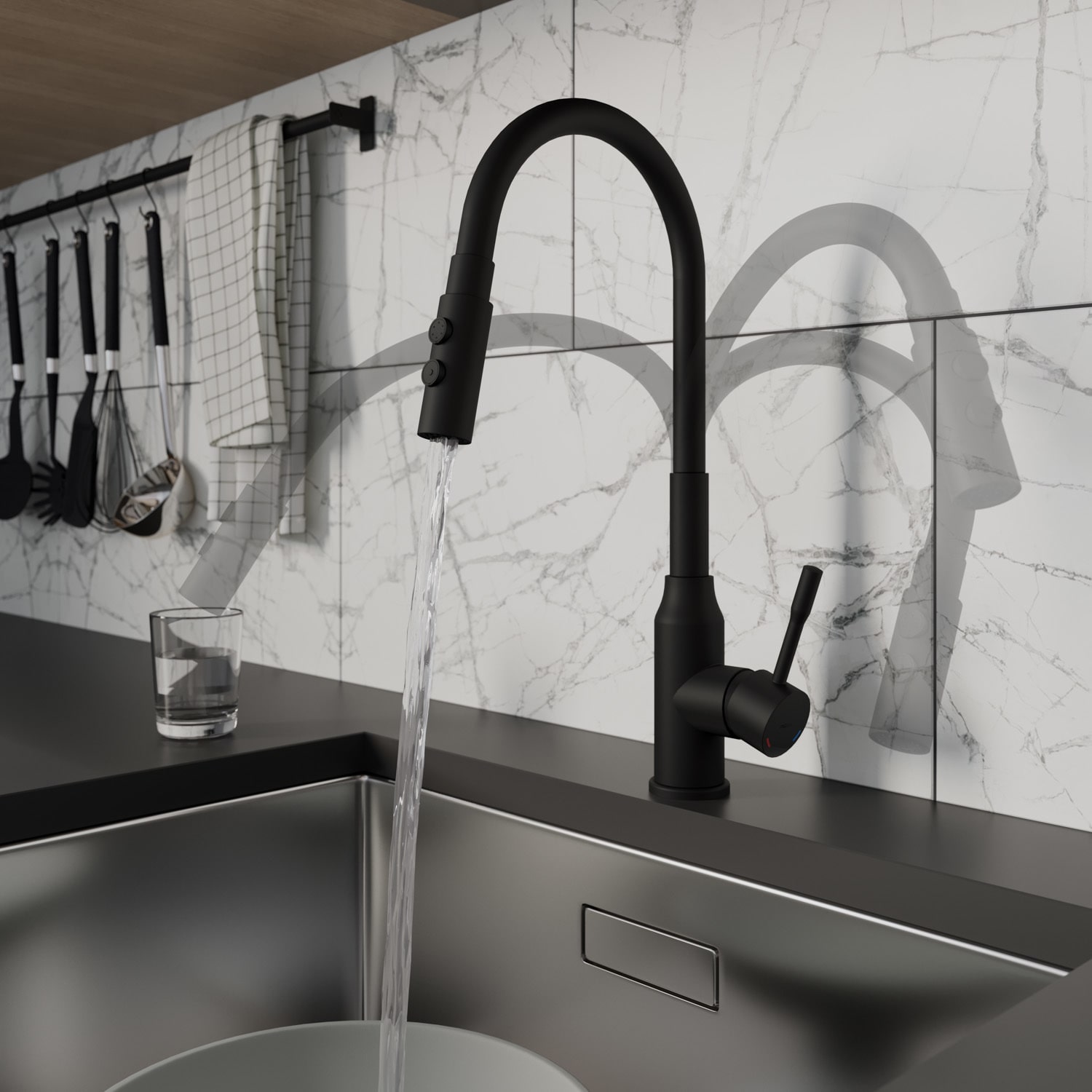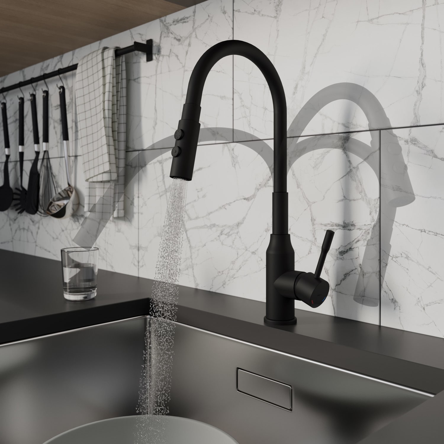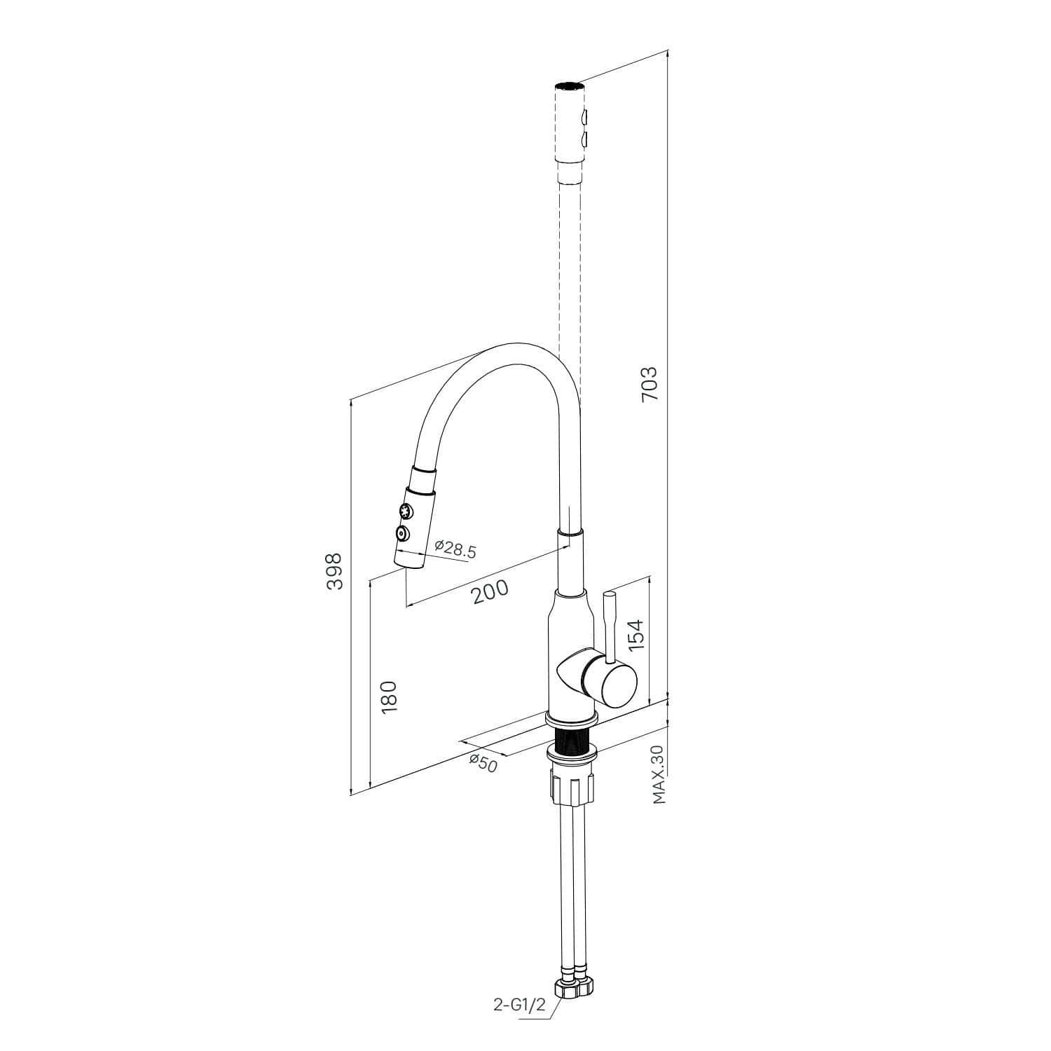 Смеситель для кухни с гибким изливом и душевой двухрежимной насадкой, однозахватный, латунь, силикон, электрофоретическое покрытие, керамический картридж 35 мм. В комлекте: гибкая подводка, крепёж. Упаковка: коробка, микрогофрокартон, индивид. мешок.