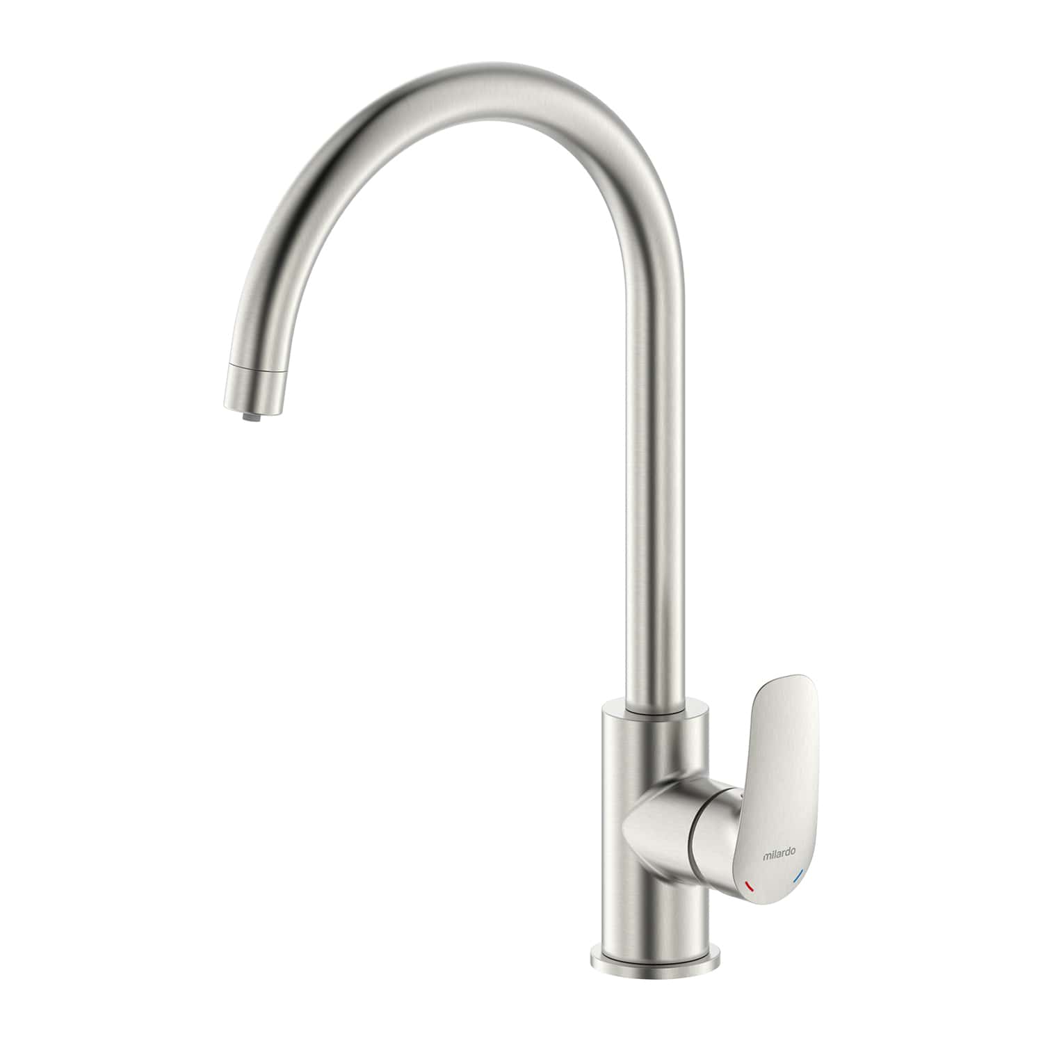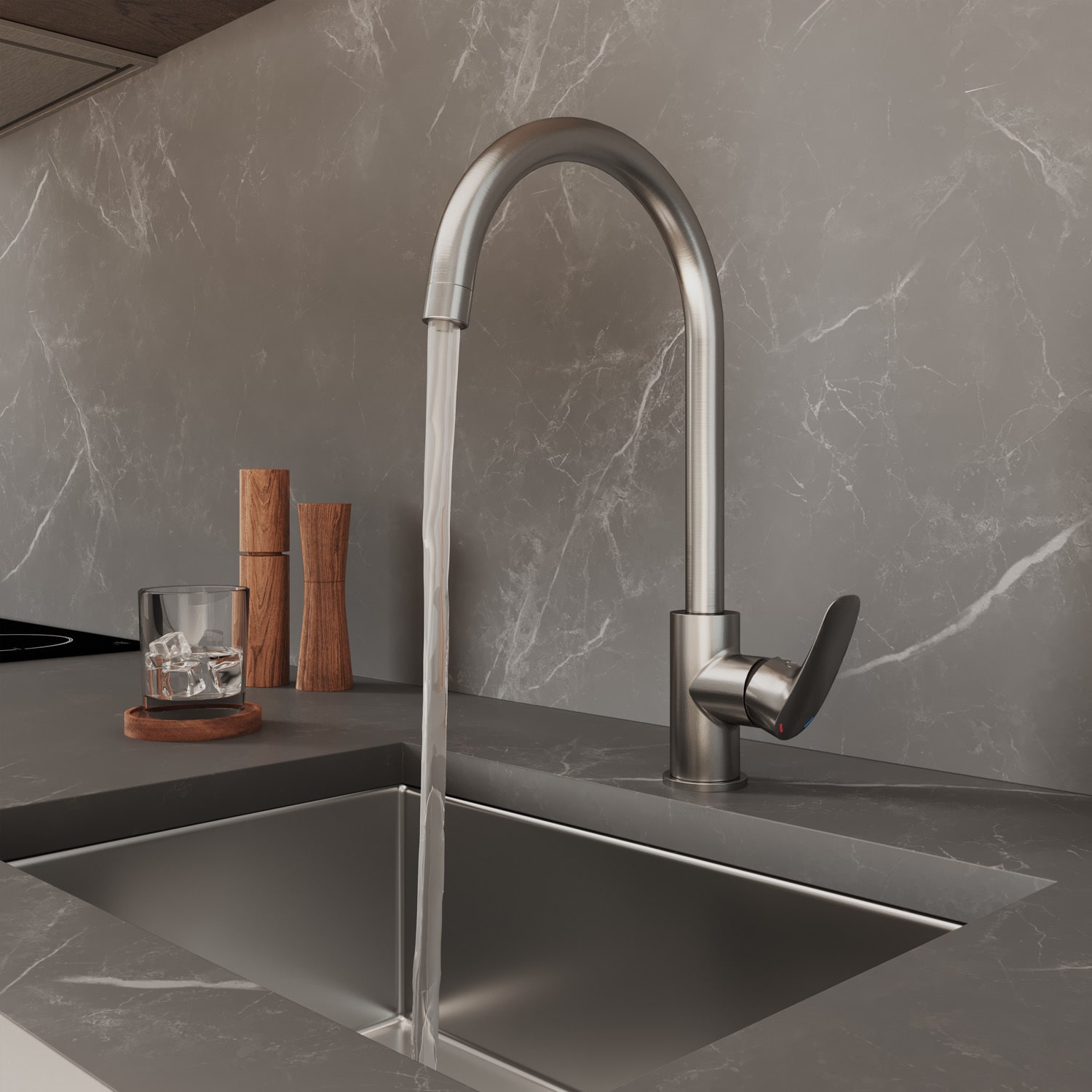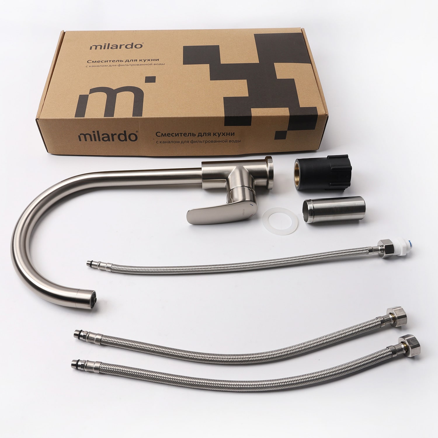 Смеситель для кухни с каналом для фильтрованной воды, однозахватный, латунь, сатин, керамический картридж 35 мм с функцией подачи фильтрованной воды, двухканальный пластиковый аэратор Neoperl с дополнительным каналом для питьевой воды. Смеситель управляется с использованием только одной ручки. Подача фильтрованной воды осуществляется при повороте ручки в закрытом состоянии. В комплекте: гибкая подводка, крепеж. Упаковка: картонная коробка, индивид мешок.
