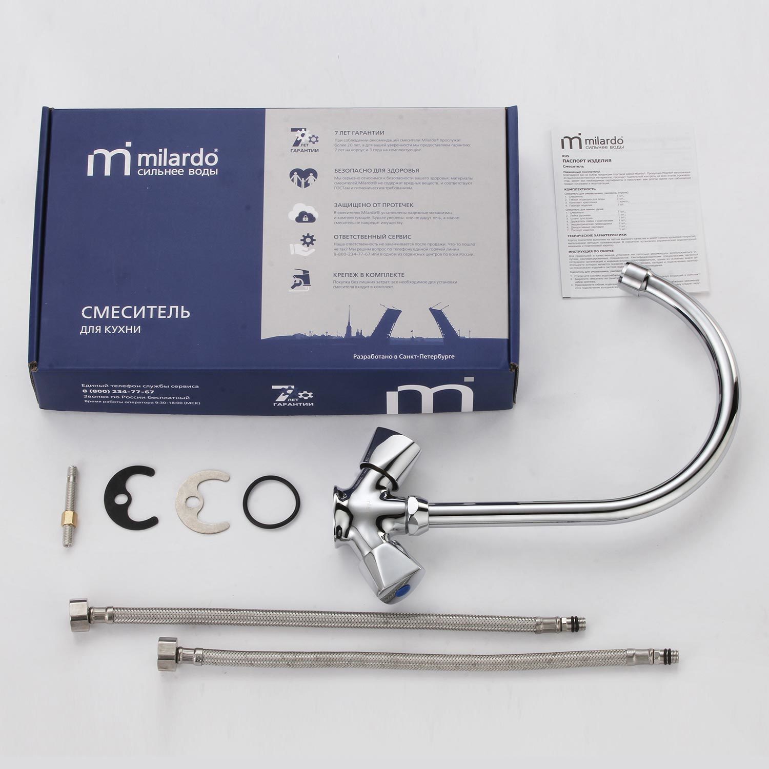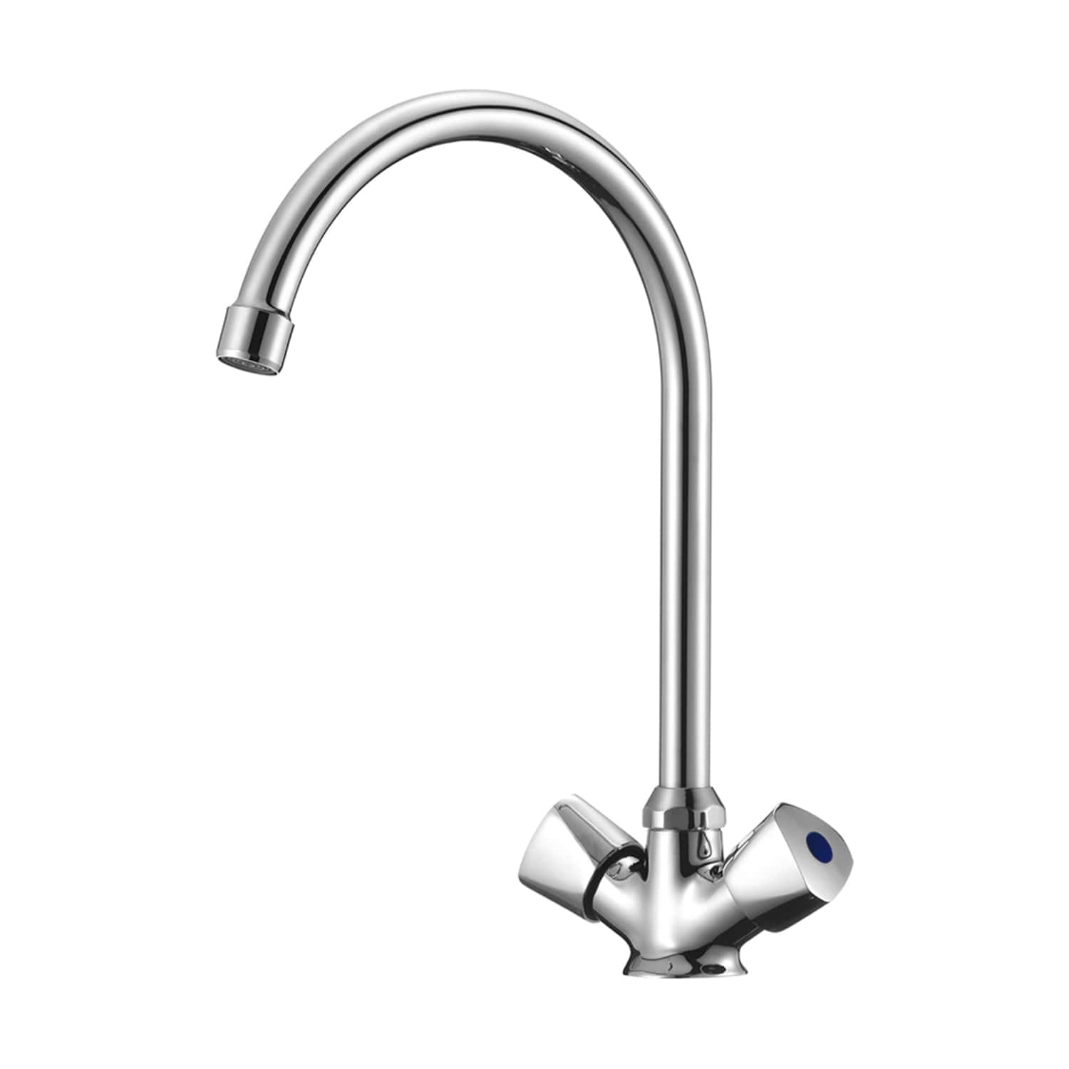 Смеситель для кухни, двухзахватный, латунь,никель-хромовое покрытие, цвет - хром, керамические кранбуксы, пластиковый аэратор. В комлекте: гибкая подводка, крепёж. Упаковка: коробка, микрогофрокартон, индивид. мешок.